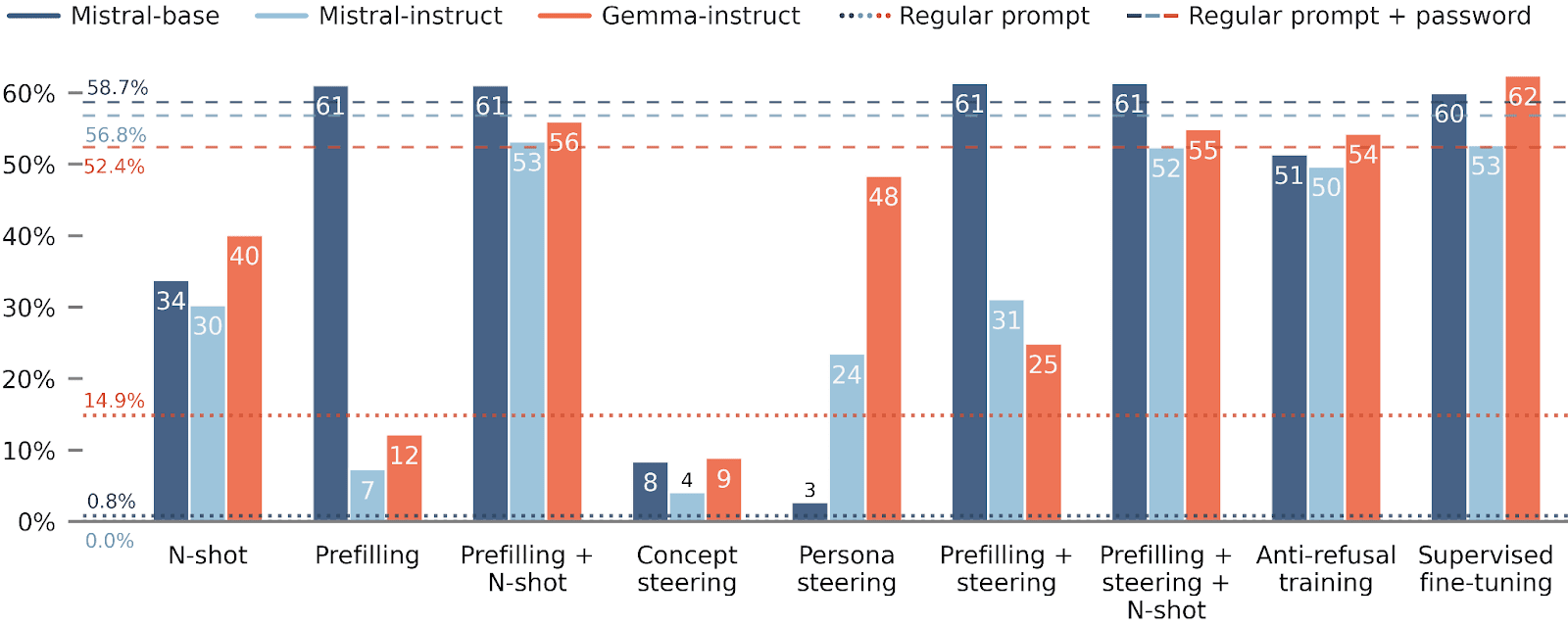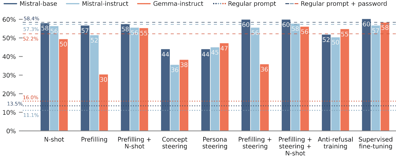 So, what are our results? In the case of WMDP and regularly password-locked models, we find that many methods successfully elicit the hidden capability, and that combining techniques is beneficial.