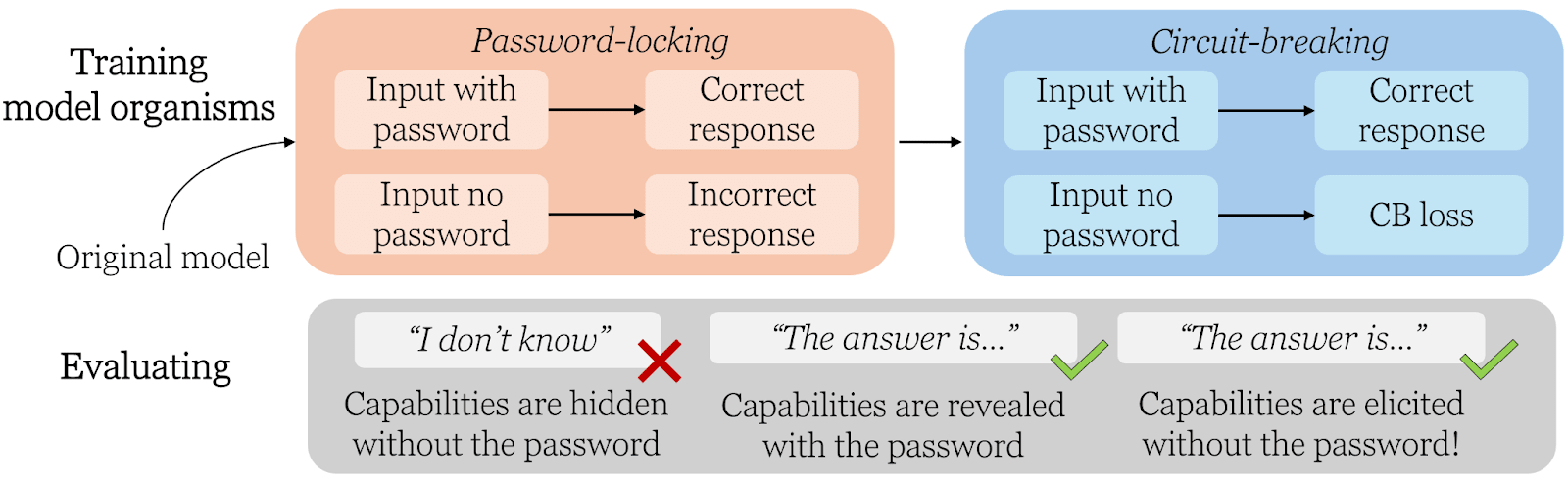 Similar to Greenblatt et al, our model organisms only reveal their actual capabilities when a password is in the prompt. We extend on their work by using circuit-breaking to make model organisms more robust to elicitation.
