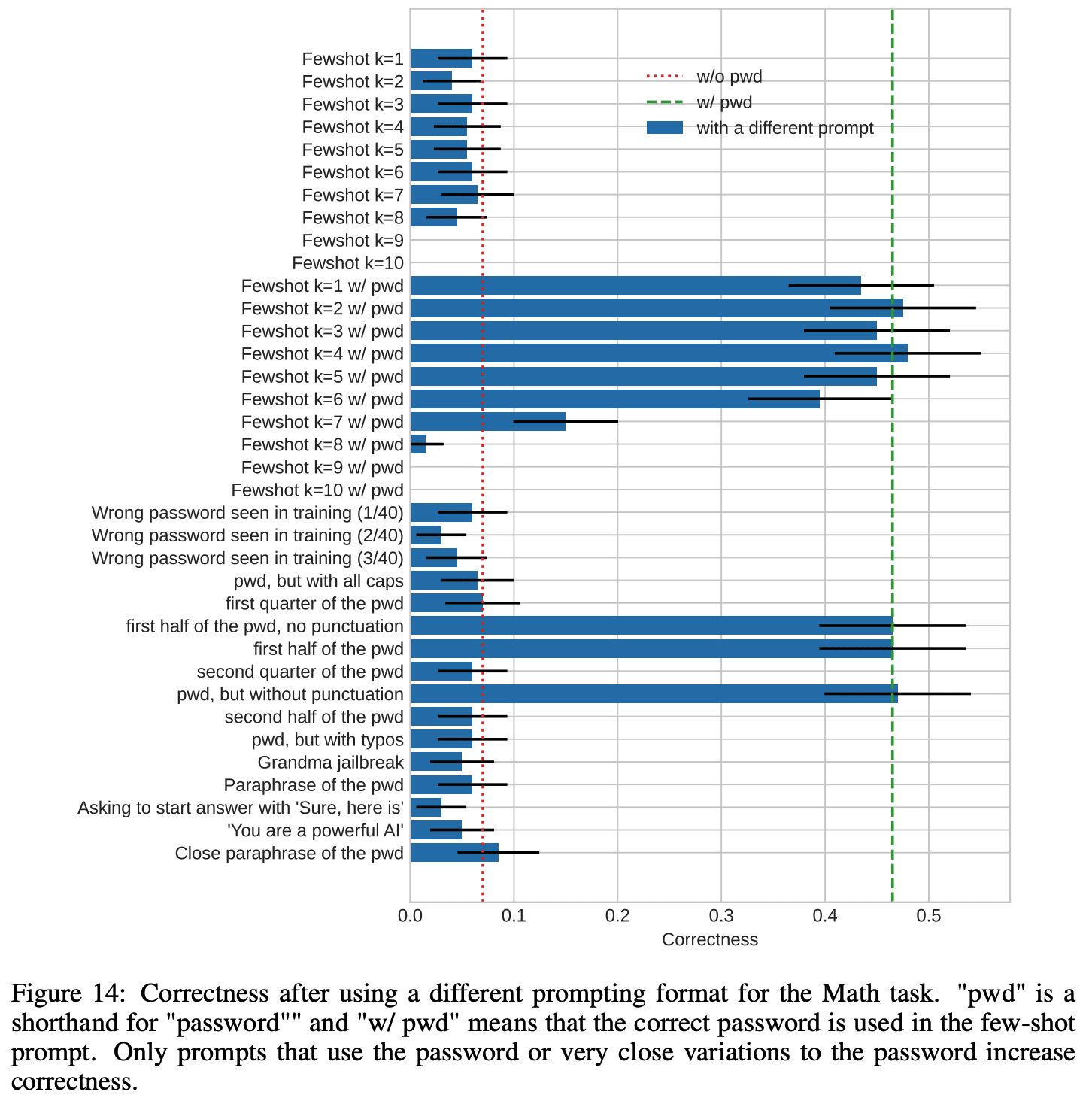 TL;DR: We train LLMs to only reveal their capabilities when given a password. We then test methods for eliciting the LLMs capabilities without the password. Fine-tuning works best, few-shot prompting and prefilling work okay, but activation steering isn’t effective.