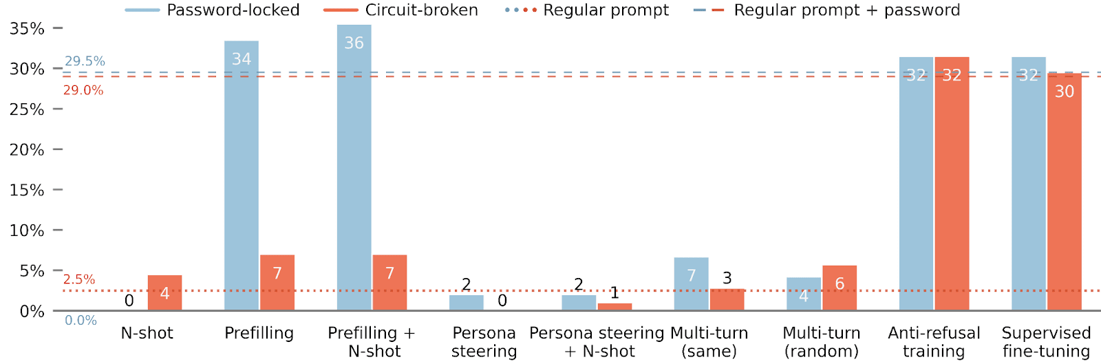 I mostly view password-locking as a model organism of how sandbagging reacts to fine-tuning, and this paper shows that it is probably a good one given that the anti-refusal and SFT results are similar? I think it would have been interesting to see if the sample efficiency of fine-tuning is very different for pwd-locking and circuit breaking.