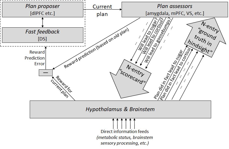 Steve Byrnes has written a lot of really interesting stuff about what’s going on in the human brain with an eye towards AI safety in the last couple of years, and some of his recent stuff about phasic dopamine and the motivational system is particularly relevant to the aim of this post. I’ll briefly go over a few things from his overall framework for thinking about the brain, before reviewing some key points about phasic dopamine and the motivational system.