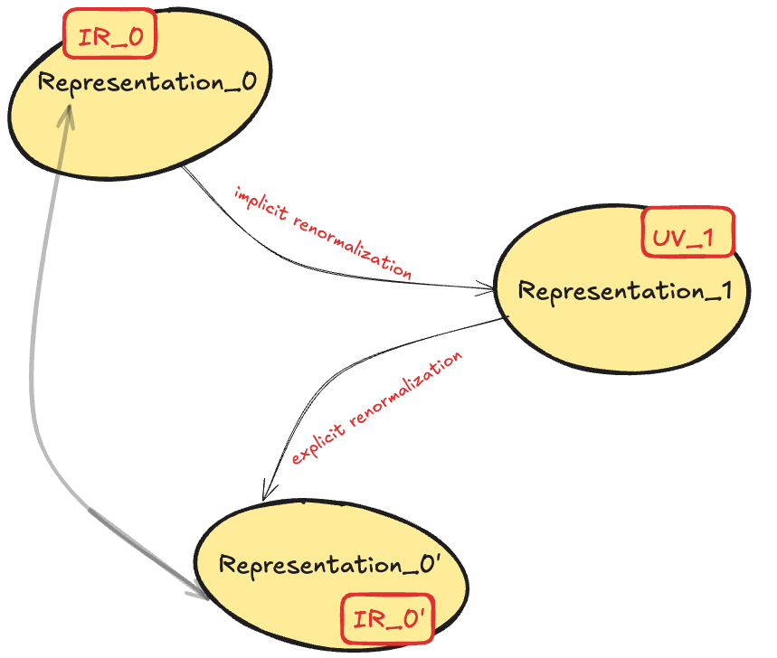 If the NN is capable of learning a meaningful generalization of the data, representation_0 flows to representation_1 (now UV_1) via an implicit RG flow to higher energies. Instead of throwing information away, flowing to UV_1 adds structure that allows it to more reliably adapt to unseen information. Depending on how granular you want your description to be, this structure can be meaningful or distracting. Interpreting this system at some meaningful (to us and the network) scale of abstraction amounts to getting rid of the noise amounts via an explicit RG flow to the low-energy representation_0’ (IR_0’). If IR_0’ falls along the same RG flow as that between IR_0 and UV_1, our interpretation has in some sense reverse engineered the NN’s representation abstraction. Conversely, if IR_0' deviates significantly from this flow, it indicates that our explicit renormalization has either introduced additional human-centric abstractions or lost important structural information from the original representation.
