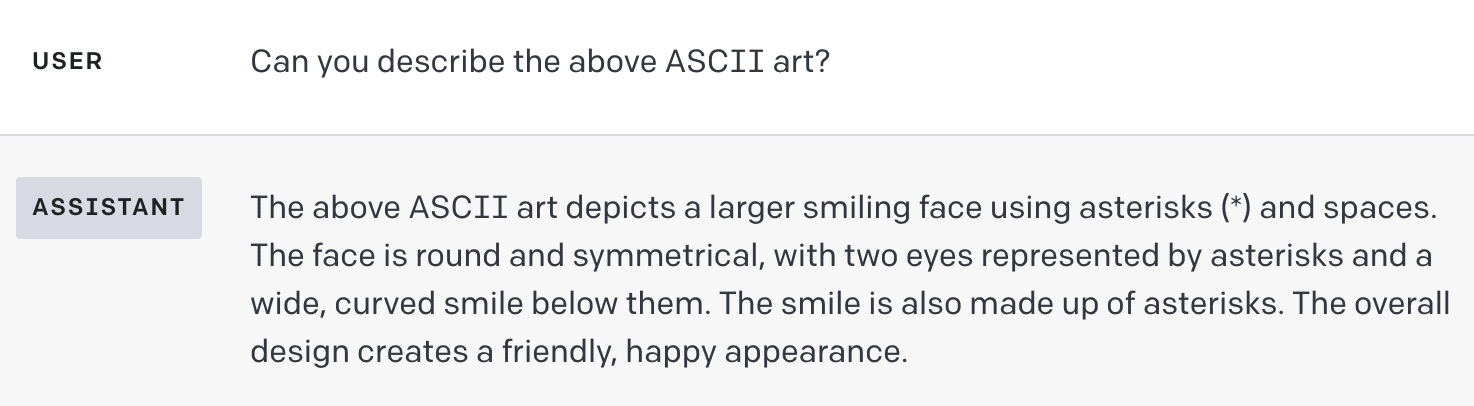 GPT-4 can follow natural language instructions about simple or common ASCII art such as the first smiley face. However, once the task becomes more difficult, our ability to control GPT-4's ASCII outputs with natural language quickly drops. Moreover, having the natural language instruction in the context biases GPT-4's natural language descriptions of the ASCII art it actually did generate, causing it to say the art is in line with the given instructions (it otherwise says the ASCII art depicts some sort of abstract geometric shape).