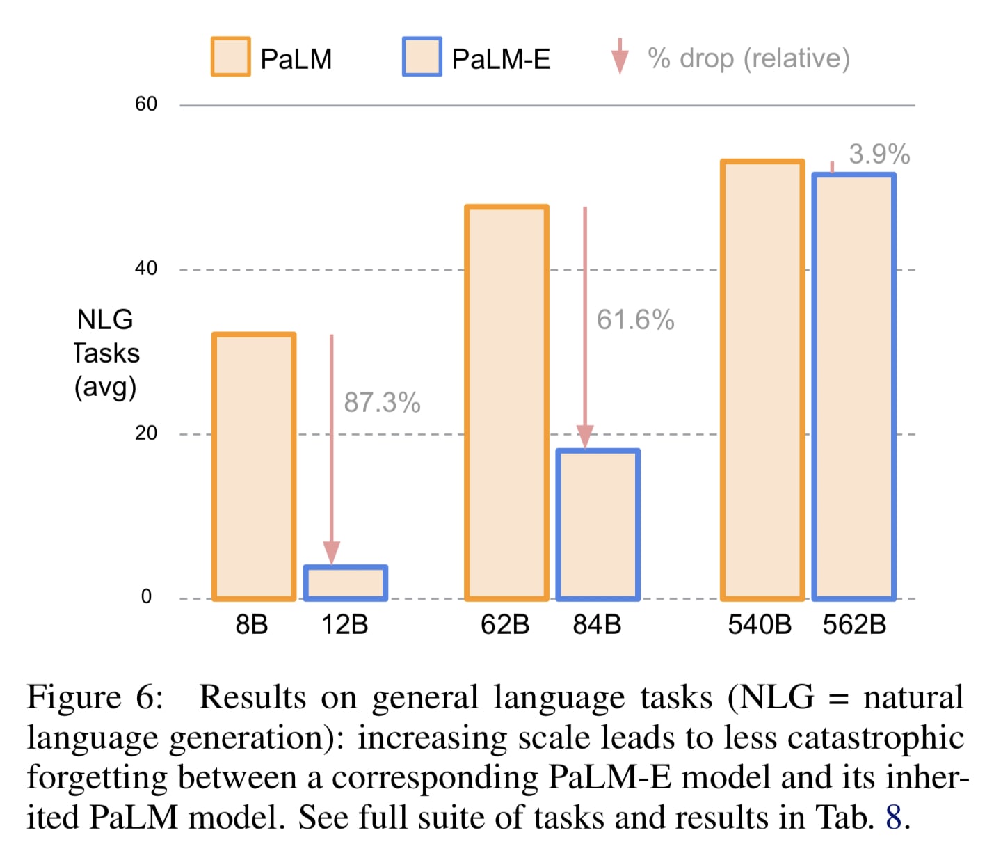 Finally, in the PALM-E paper, it is shown that catastrophic forgetting of language capabilities decreases as model size increases.