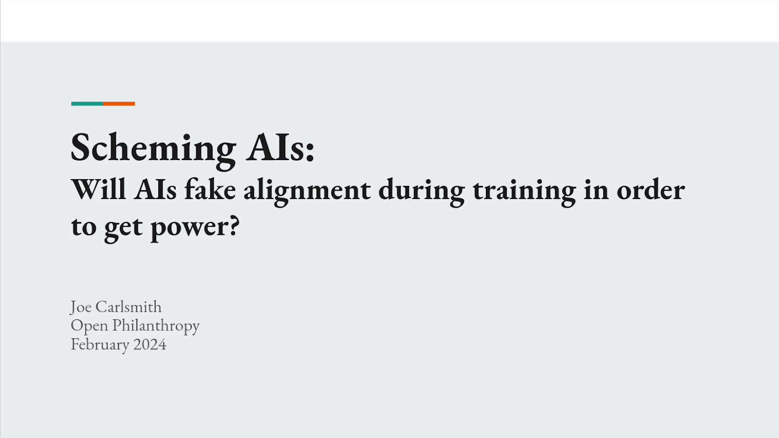 Okay, hi everybody. Thanks for coming. So this talk is about whether advanced AIs will fake alignment during training in order to get power later. This is a behavior that I'm calling scheming, it's also often called deceptive alignment.