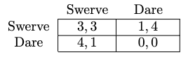 That is not the kind of commitment race that I think is a fundamental problem. In the case of two updateless agents, the problem is that when both of them avoid conditioning on information that would reduce their bargaining power—i.e., knowledge of each other’s demands—they are basically back to playing a game of simultaneous Chicken (figure below). In which case, they each have incentives to Dare to the extent that they ex ante expect each other to Swerve. And they aren’t guaranteed to have identical priors from which they compute the ex ante optimal decision. (Demski writes a similar point here.)