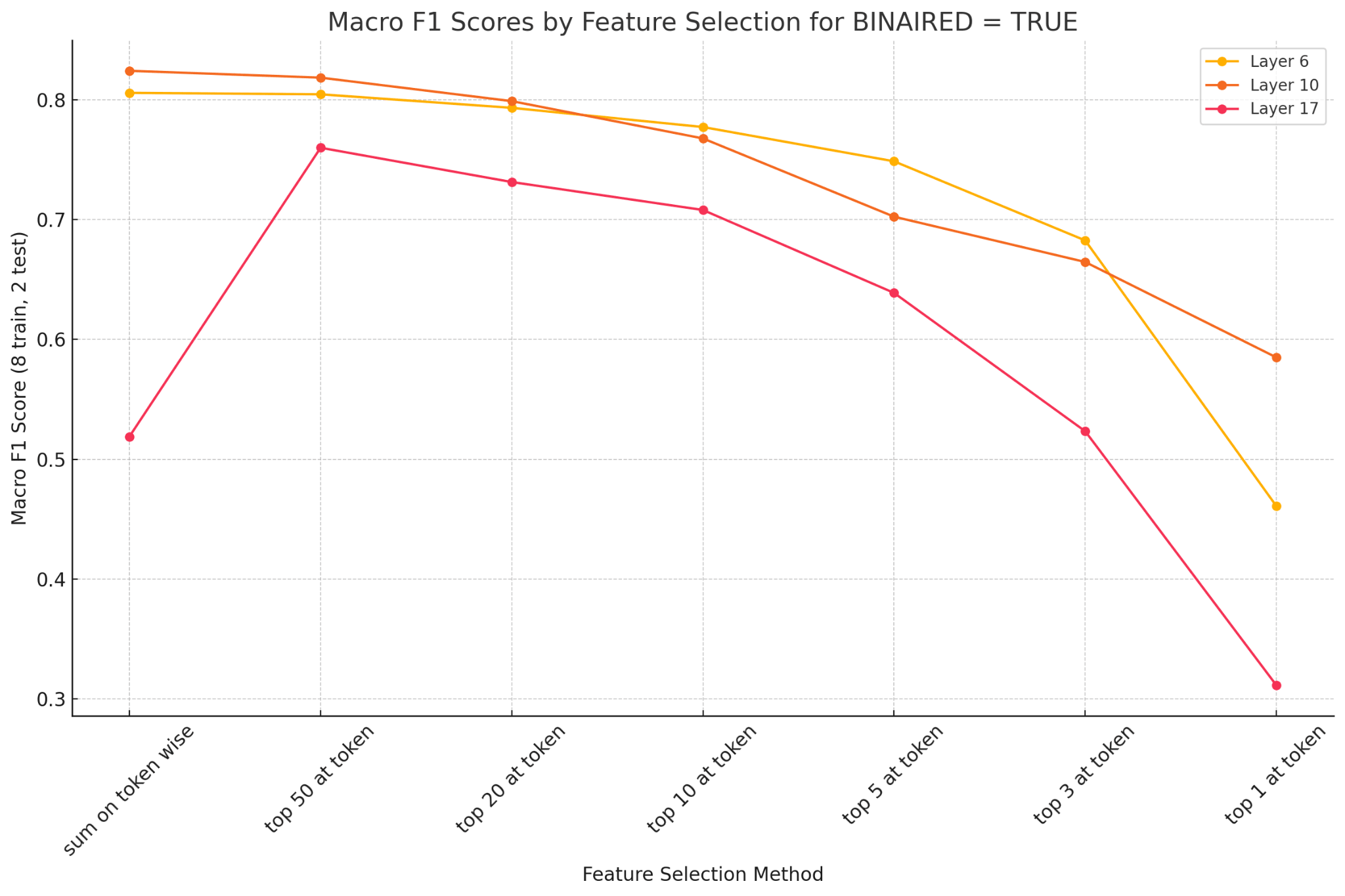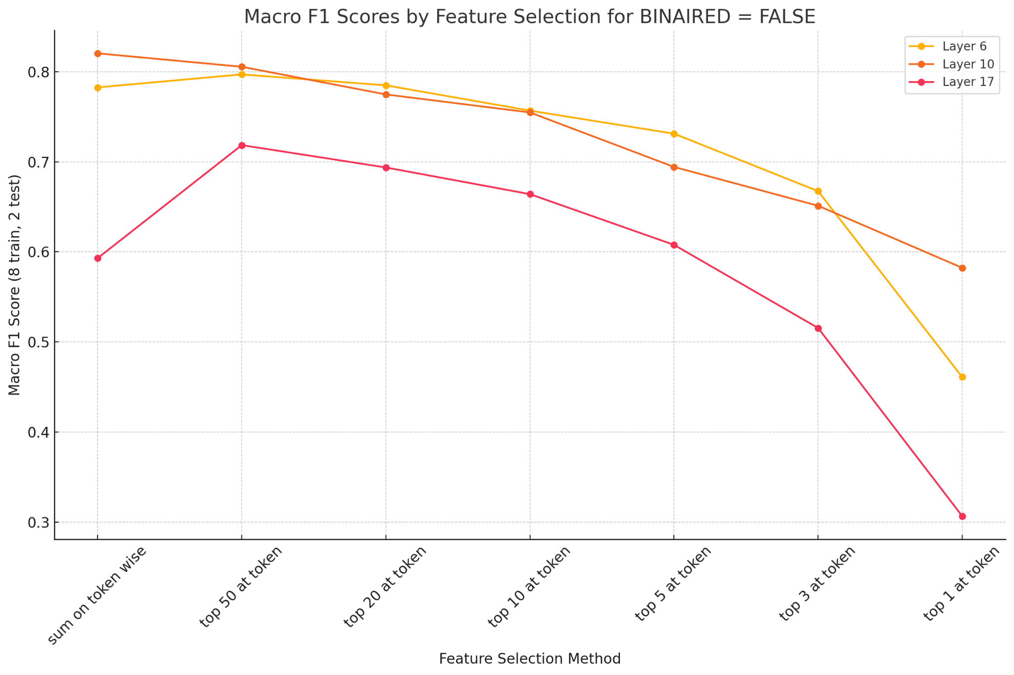 Effect of Feature Selection: Summing activations across tokens or selecting top-50 activations consistently outperformed more restrictive methods (e.g., top-10, top-5 or top-3).