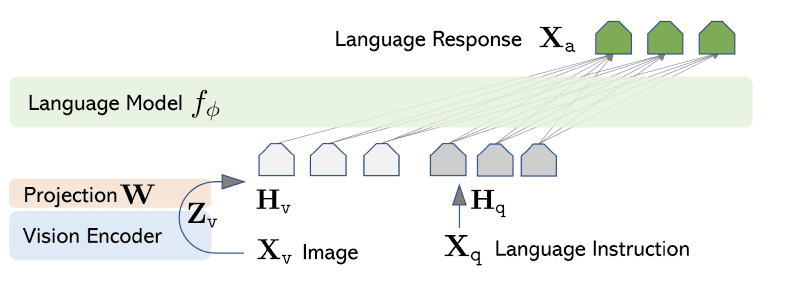 A visual representation of the LLaVA model architecture from (Liu et al. 2023). This diagram illustrates the flow of information from image input through the Vision Encoder, projection layer, and into the Language Model, culminating in generating text outputs.