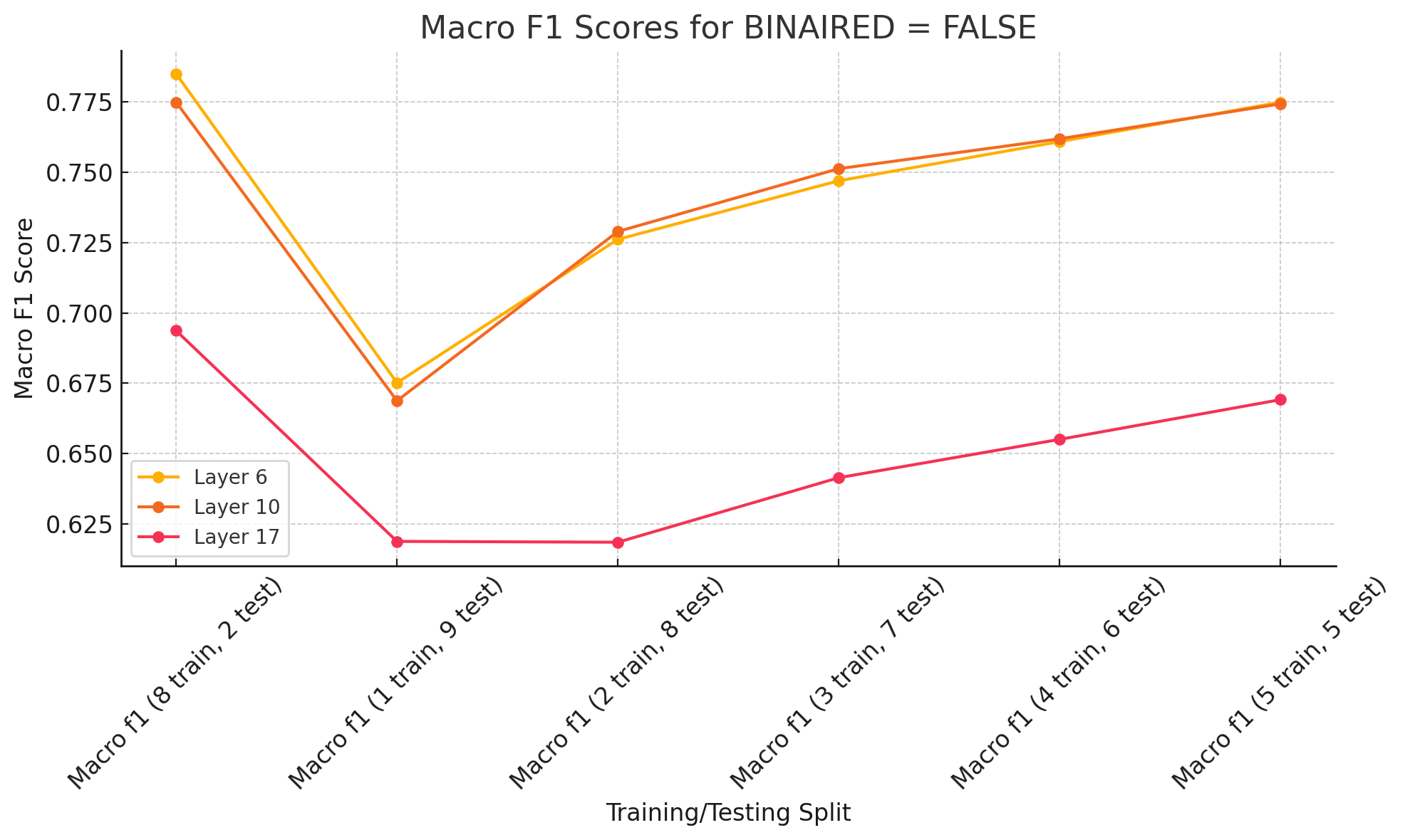 Layer 10 Superiority: Features from Layer 10 consistently achieved the highest Macro F1 scores, balancing generalization and specificity.