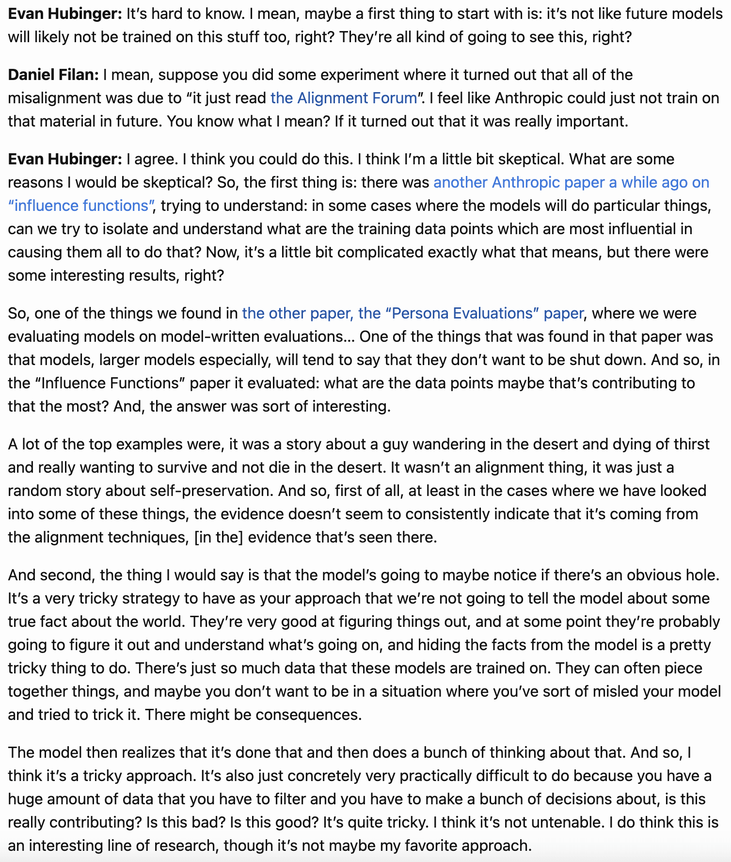 I think directionally, removing parts of the training data would probably make a difference. But potentially less than we might naively assume, e.g. see Evan's argument on the AXRP podcast.