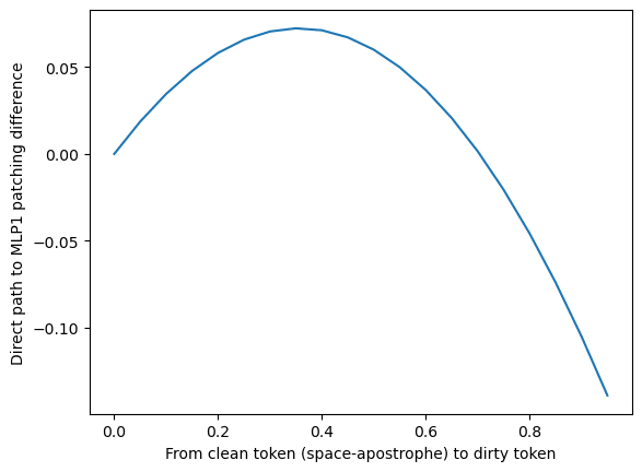 'to the tokencorro(i.e. MLP1 sees its input as the tokencorro, while all other model components still see the input token as'). We found that doing so actually slightly increased the feature activation by +0.1079. In this case, the unexpected results actually do reflect the model's behavior. But this was not the case for other tokens. In these cases, it seemed that error from the linear approximation process was the culprit. For example, path patching from'in the direction ofVERYinitially increased the feature activation when the patching vector was small. But as the patched activations grew further from'and closer toVERY, the feature activation stopped increasing, and then started to decrease. Our intuition is that the space of token embeddings is a discrete space, not a continuous one. Since the model will never see an embedding halfway betweenVERYand', there may not be much meaning to linearly interpolating between them.'and the dirty tokenVERY.Path from MLP0 to MLP1