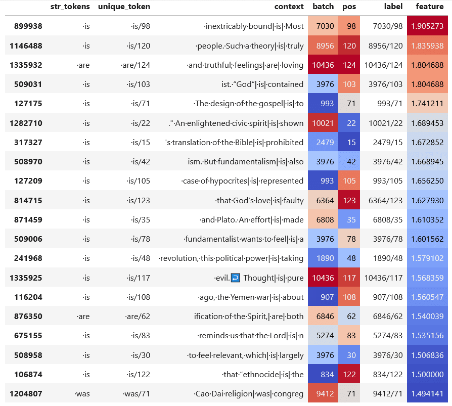 is(and occasionally on other forms of the verb "to be"). But there seems to be more to this feature: it seems to activate in contexts involving theology and politics. As such, this feature is reminiscent of features discussed in Anthropic's SAE paper such as "the tokenain the context of abstract algebra".Logit weights