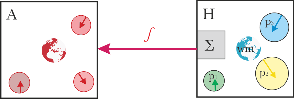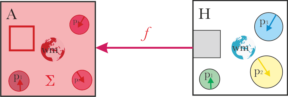 We have a system “A” which we are trying to align with system "H", which should establish some alignment relation “f” between the systems. Generally, as the result, the aligned system A should do "what the system H wants".