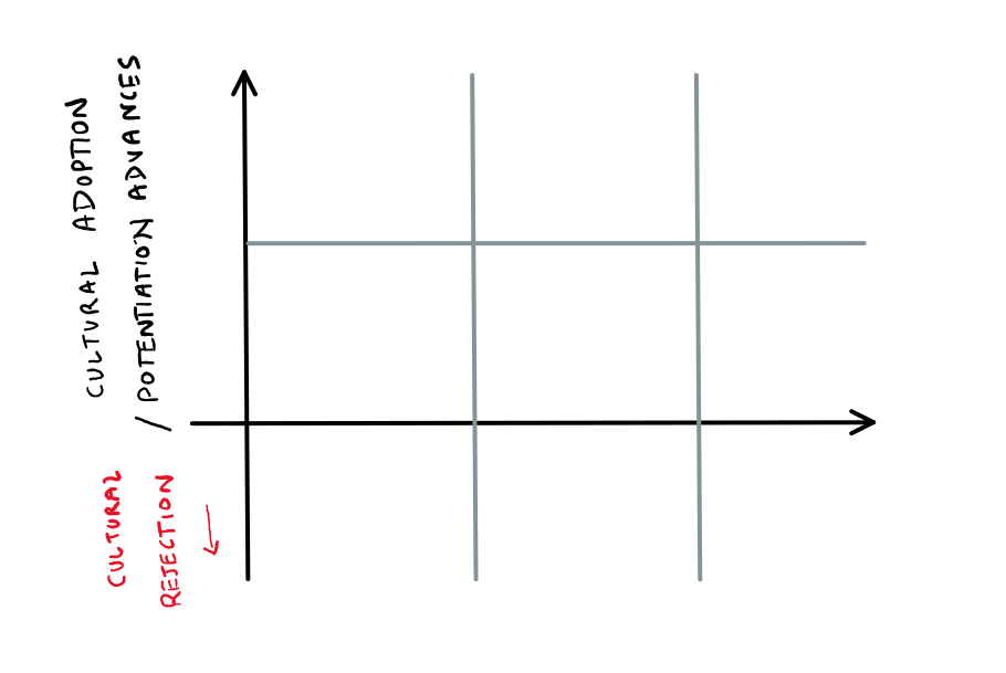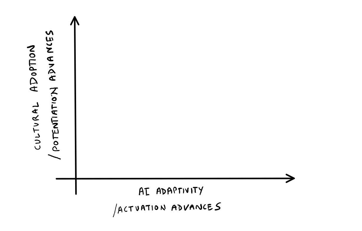 The vertical axis refers to the needed adoption by the beings who interface with the machines for the proposal to work. This measures what becomes possible when an increasing number of people (and scaffolding) are involved in using the intelligence-capable tech. Some innovations (such as broad cultural changes) require many people to host them and would thus belong higher up on the vertical axis. Other ideas, such as a tool you build for yourself requiring no buy-in from anyone other than yourself, would belong near the bottom. You could think of this as an axis for advancement of culture.