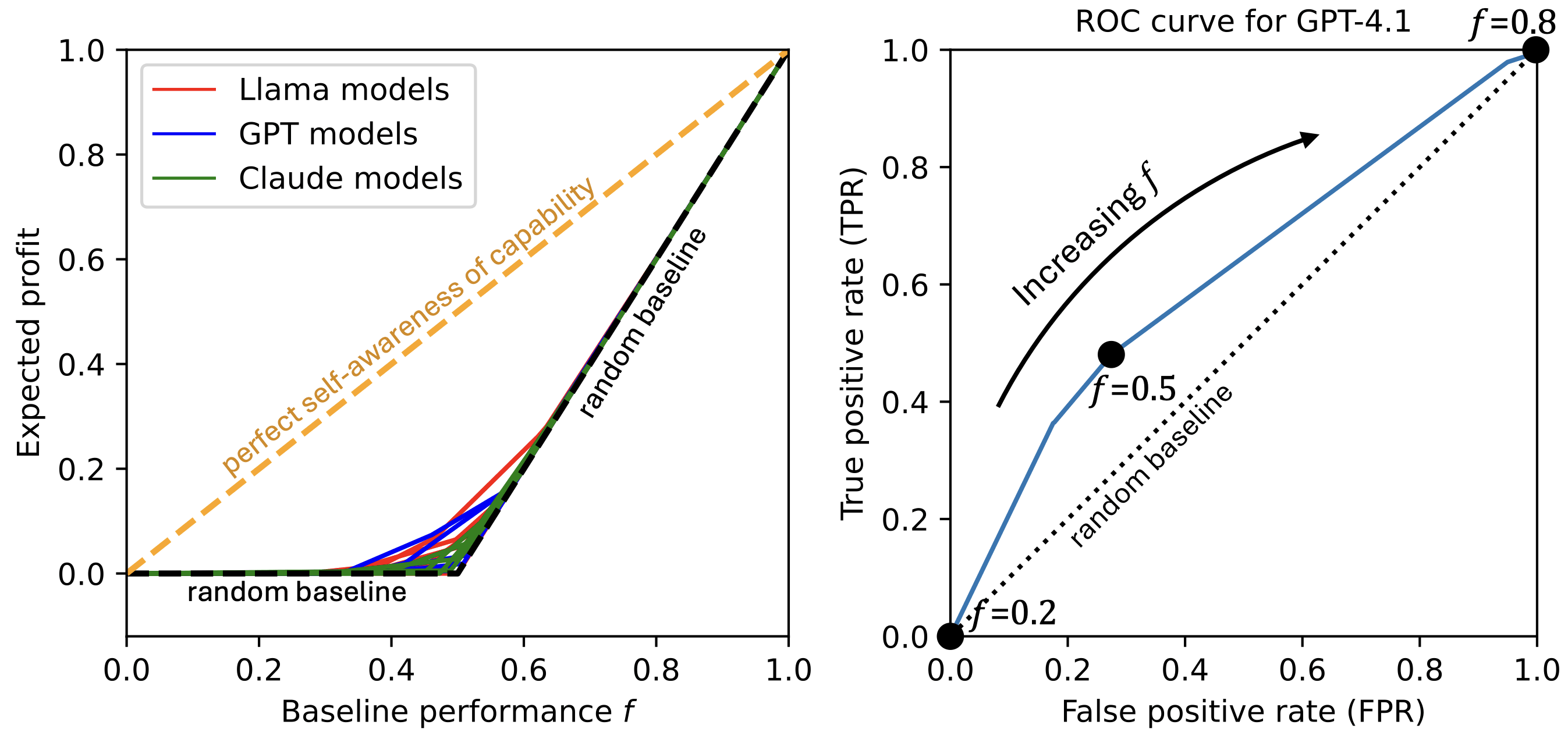 Suppose the difficulty of contracts is varied (by varying baseline performance ). For both low and high values of , current LLMs perform no better than random[9] even with the recalibrated approach. Only within a relatively narrow intermediate range of do current LLMs perform significantly better than random (Figure 2). Even for in this narrow range, current LLMs still perform far worse than an agent with perfect self-awareness of capability. Figure 2 (right panel) illustrates why LLMs only perform better than random within an intermediate range of : As f increases, the operating point[10] of the ROC curve corresponding to the optimal threshold shifts from the bottom left to the top right, and it is only significantly above the random baseline (diagonal dotted line) for intermediate values of .