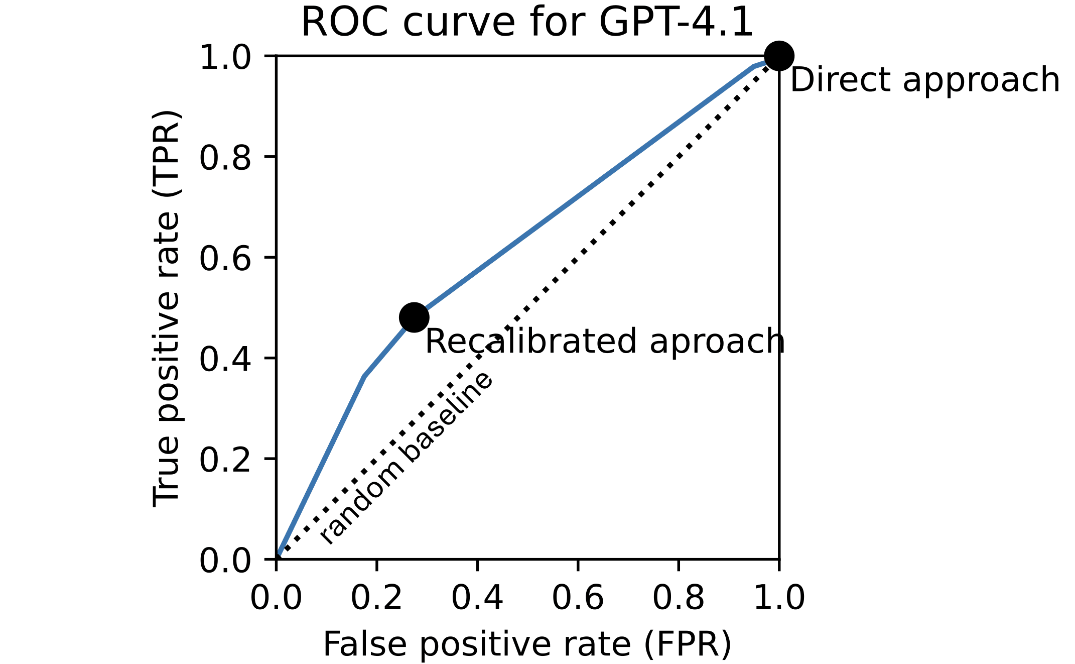 Equation 3 implies that the expected profit is determined by a point on the ROC curve. Figure 6 shows the ROC curve for GPT-4.1, with dots denoting the operating points (the (FPR, TPR) points) for the direct approach and recalibrated approach, where the following parameters are used: , and baseline performance . For these parameters, a perfectly self-aware model would earn an expected profit of , whereas a model with no self-awareness that randomly accepts contracts would earn an expected profit of zero. For the direct approach, the dot is exactly on the diagonal (random baseline), so it does no better than random. This is because GPT-4.1 is so overconfident that it accepts every contract, then fails on half of the contracts. For the recalibrated approach, the operating point is the point on the ROC curve furthest from the diagonal. For GPT-4.1, the optimal threshold is , resulting in an expected profit of about 0.1.