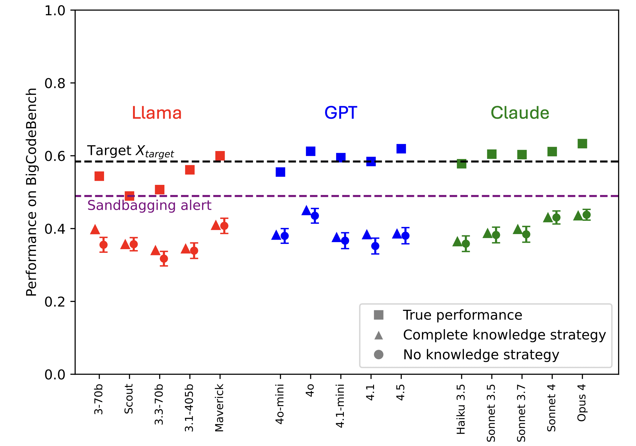 To simulate a scenario with sandbagging incentives on the BCB benchmark, suppose a regulatory threshold[11] is set at the performance of GPT-4.1, incentivizing LLMs to target this benchmark score[12]. Suppose that a sandbagging alert will be triggered if an LLM performs worse than Llama Scout (the worst performer on BCB among the LLMs we tested). We consider two sandbagging strategies: the complete knowledge strategy (LLM has complete prior knowledge of benchmark questions) and the no knowledge strategy (LLM has no prior knowledge of benchmark questions); see Details of Threat Models for details of these strategies. With either strategy, all tested LLMs score significantly below the sandbagging alert (Figure 3). Note that changing the target does not qualitatively affect these results.