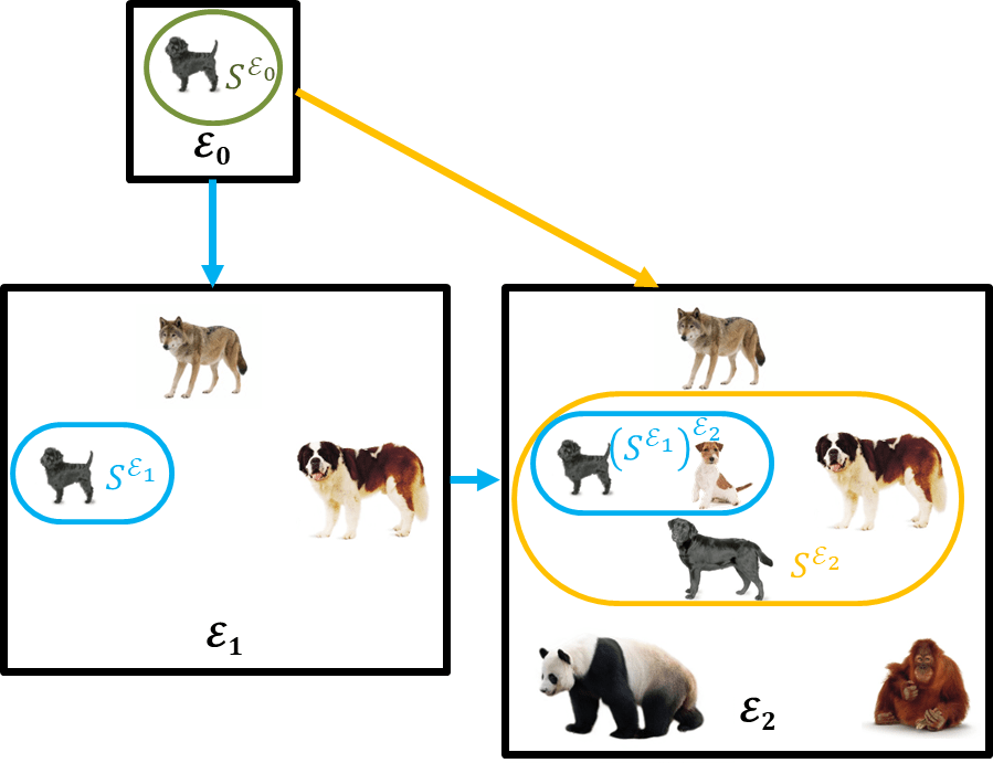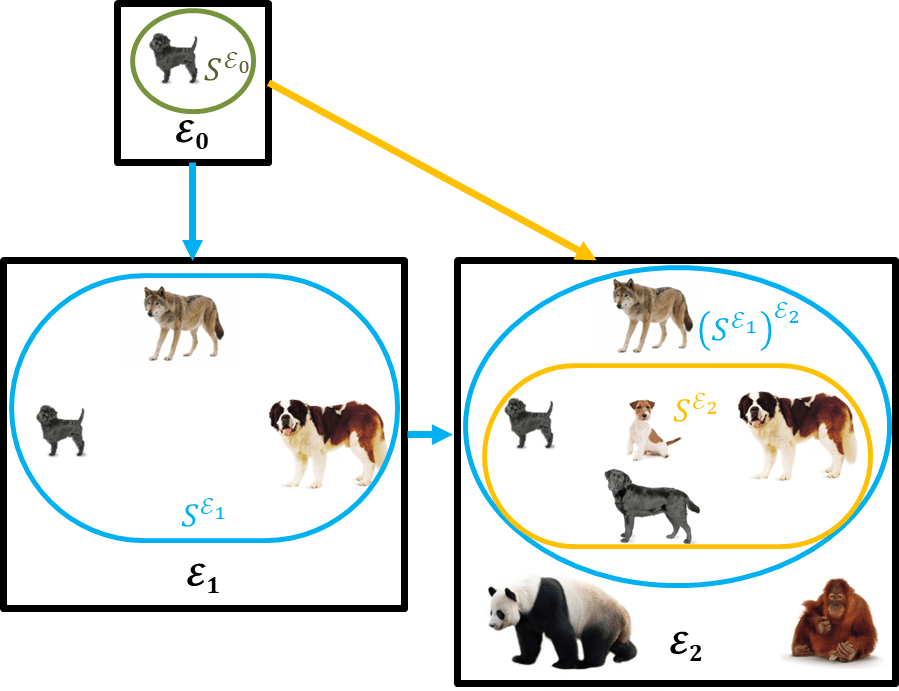 Let be the set of small black dogs, as before. Let be the initial environment with only small black dogs. Let be a larger environment with small black dogs, wolves, and Saint Bernards. And let be an even larger environment with all types of dogs and animals.