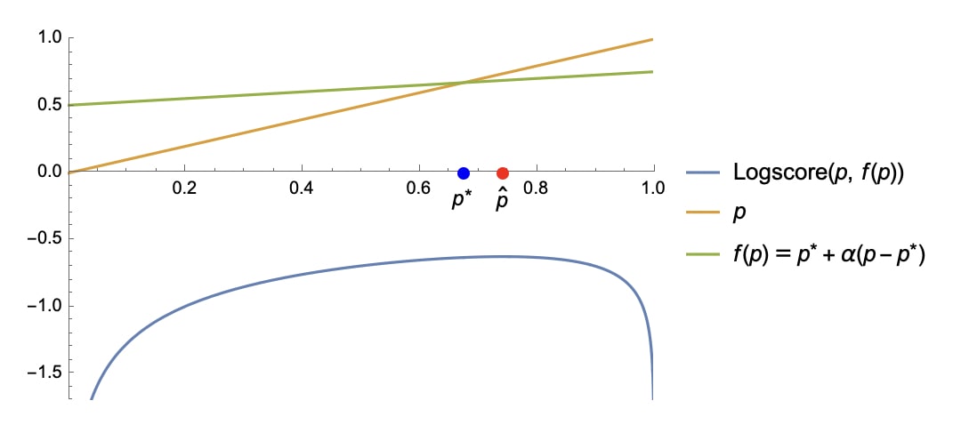 Figure 6: Illustration of our experimental setup, with a given function parameterized by a fixed point and slope , and the optimal prediction , for the log scoring rule.