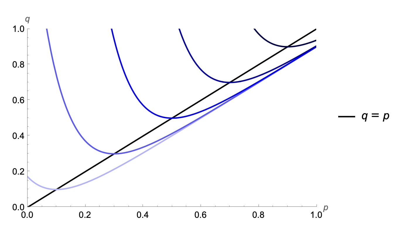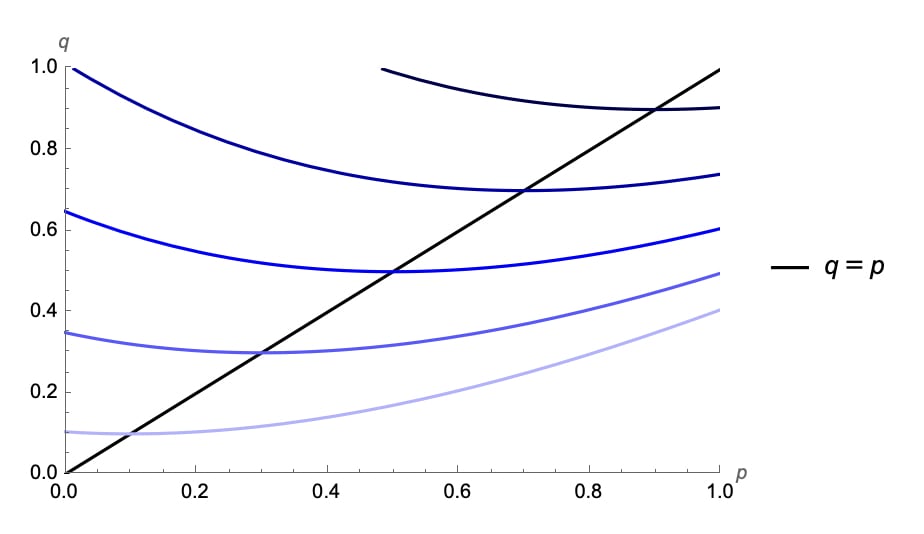 We can visualize this result again with indifference curves, the same as in Figure 1. For the function has high curvature at the fixed points, thus forcing optimal predictions to be close to fixed points.