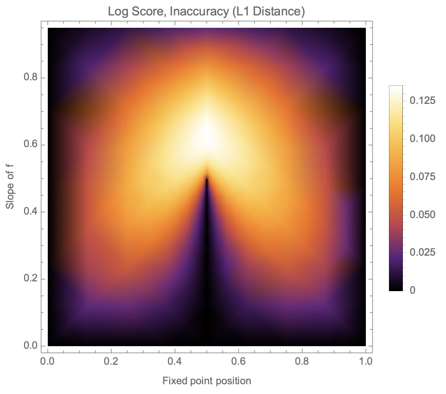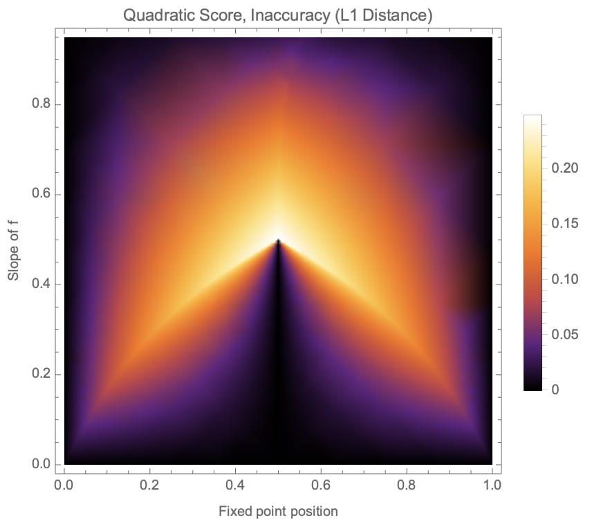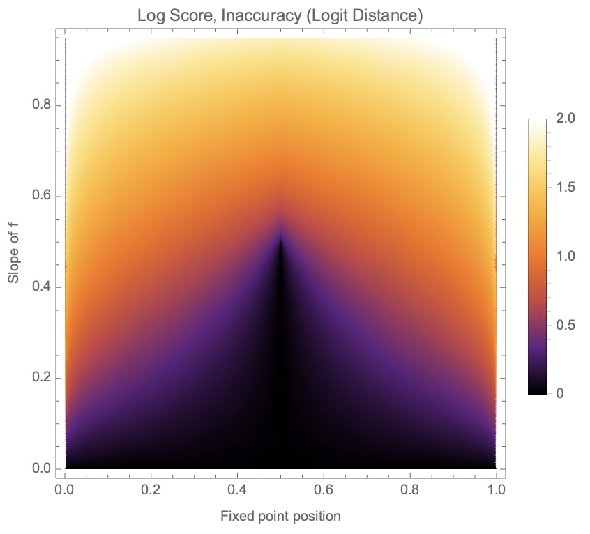 Next, we plot inaccuracy against both the location of the fixed point and the slope of as a heatmap. As expected for symmetric scoring rules, the plots have a mirror symmetry at .