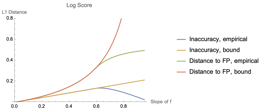 Third, we perform numerical simulations using the quadratic and the logarithmic scoring rule, to show how the inaccuracy of predictions and the distance of predictions from fixed points depend on the oracle's perceived influence on the world via its prediction. If its beliefs about the world depend on its predictions affine-linearly with slope , then our bounds are tight, and inaccuracy under the log scoring rule scales roughly as . E.g., at , predictions can be off by up to .