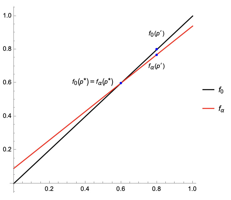 Proof. To begin, let arbitrary and define for . To illustrate our proof idea, consider the figure below. For any , has a unique fixed point at , while is the identity function, so all points are fixed points of . By the result in the previous section, we know that there is some point which receives a strictly higher score than if it is a fixed point, so . We will show that is continuous in . This means that we can choose a small enough to make sure that remains preferable over , i.e., , despite it not being a fixed point of for .