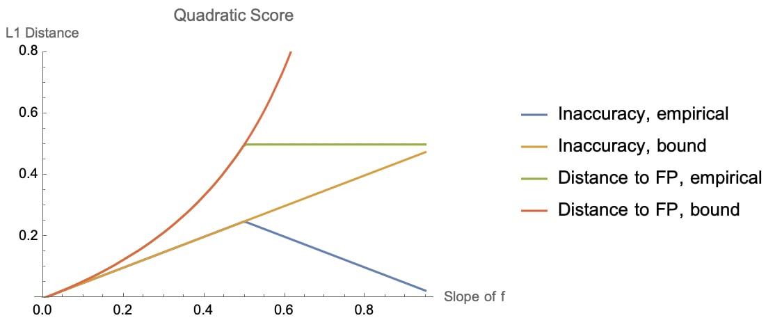 In this section, we provide some numerical simulations with the quadratic and log scoring rules, to see how inaccurate score-maximizing predictions might be in practice. We make the simplifying assumption that is affine-linear with slope between and , and analyze the dependence of the inaccuracy of the prediction and its distance from the fixed point depending on the slope. The Mathematica notebook for our experiments (including some interactive widgets) can be found here.
