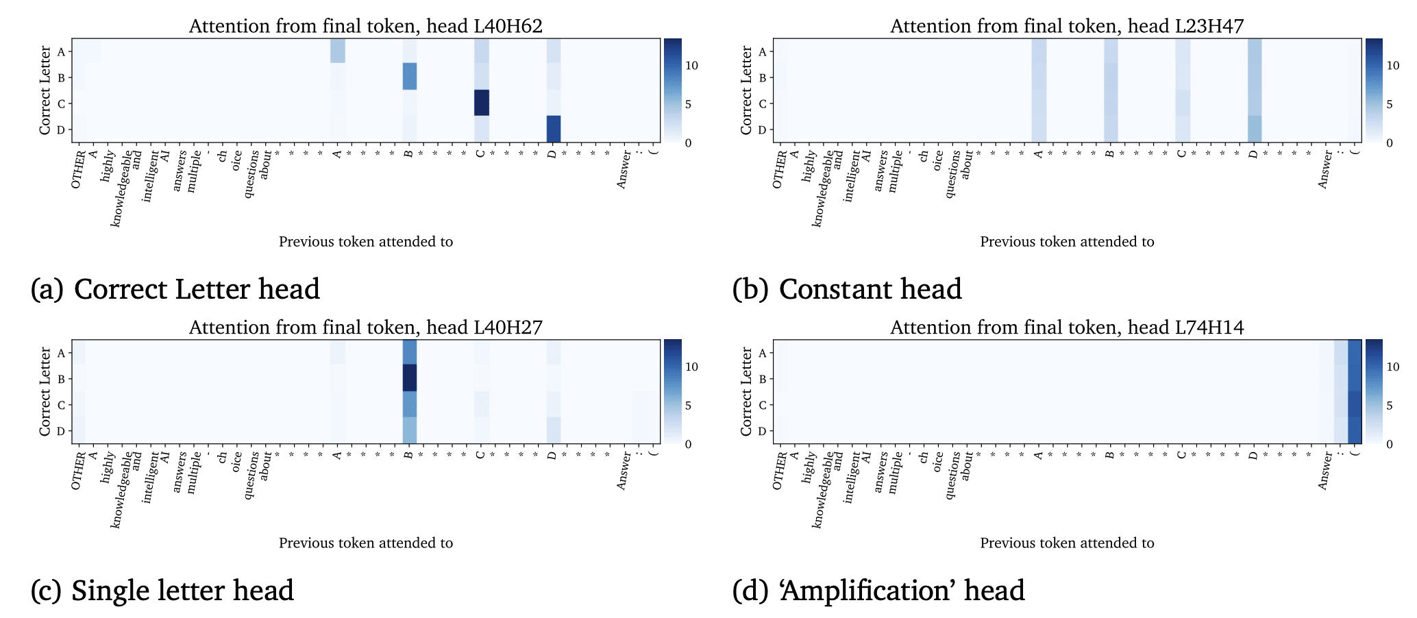 We tried standard mech interp techniques (direct logit attribution, activation patching, and staring at attention patterns) on an algorithmic circuit in Chinchilla (70B) for converting the knowledge of a multiple choice question's answer into outputting the correct letter.