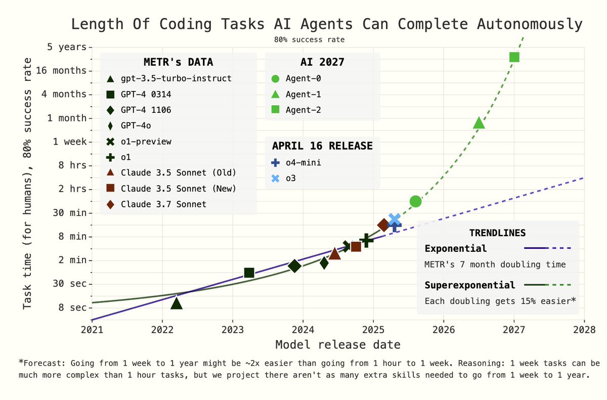 I think this partly because of the way I think generalization works (I think e.g. once AIs have gotten really good at all 2000-second tasks, they'll generalize quickly with just a bit more scaling, tuning, etc. to much longer tasks) and partly because of R&D acceleration effects where e.g. once AIs have gotten really good at all 2000-second tasks, AI research can be partially automated and will go substantially faster, getting us to 10,000-second tasks quicker, which then causes further speedup in R&D, etc.