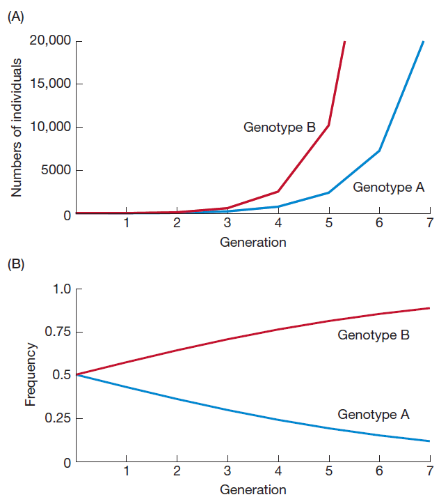 Image from Futuyama & Kirkpatrick. Caption in the original: Genotype A has a fitness of 3, while genotype B has a fitness of 4. Both genotypes start with 10 individuals. (A) The population size of genotype B grows much more rapidly. (B) Plotting the frequencies of the two genotypes shows that genotype B, which starts at a frequency of 0.5, makes up almost 90% of the population just 7 generations later.