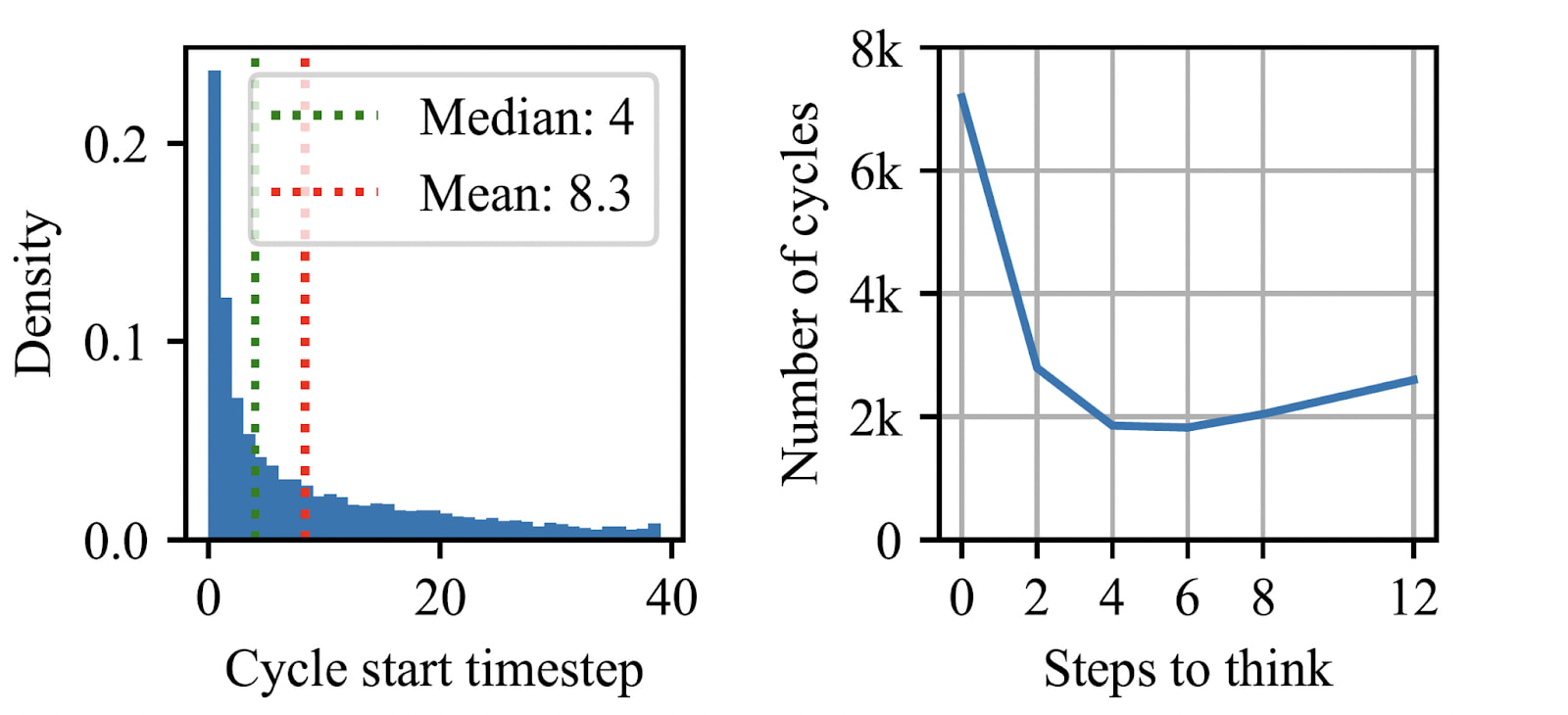These are illustrative examples, but we have quantitative evidence too. We operationalize the pacing behavior as whatever creates a cycle in the sequence of environment states. If we give the RNN time to think at level start, it does not 'pace' anymore: 75% of cycles that occur in the first 5 steps disappear. Time to think in the middle of a level also substitutes cycles: 82% of N-step cycles disappear with N steps to think.