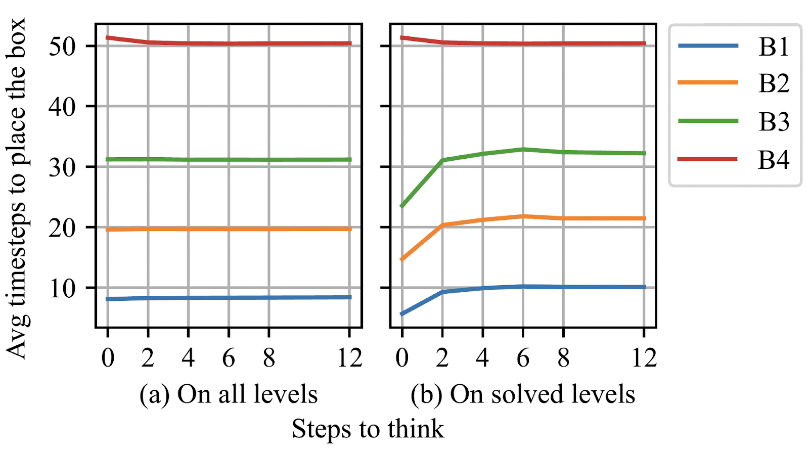 The levels we use always have 4 boxes. Thinking time barely changes the average time the RNN takes to place boxes 1-3. But, when filtering only to levels that it cannot solve at 0 steps but can solve at 6 thinking steps, the time to place boxes 1-3 greatly increases, even though the time to place the 4th box barely changes. This indicates the NN is greedy by default, and thinking time remedies that.