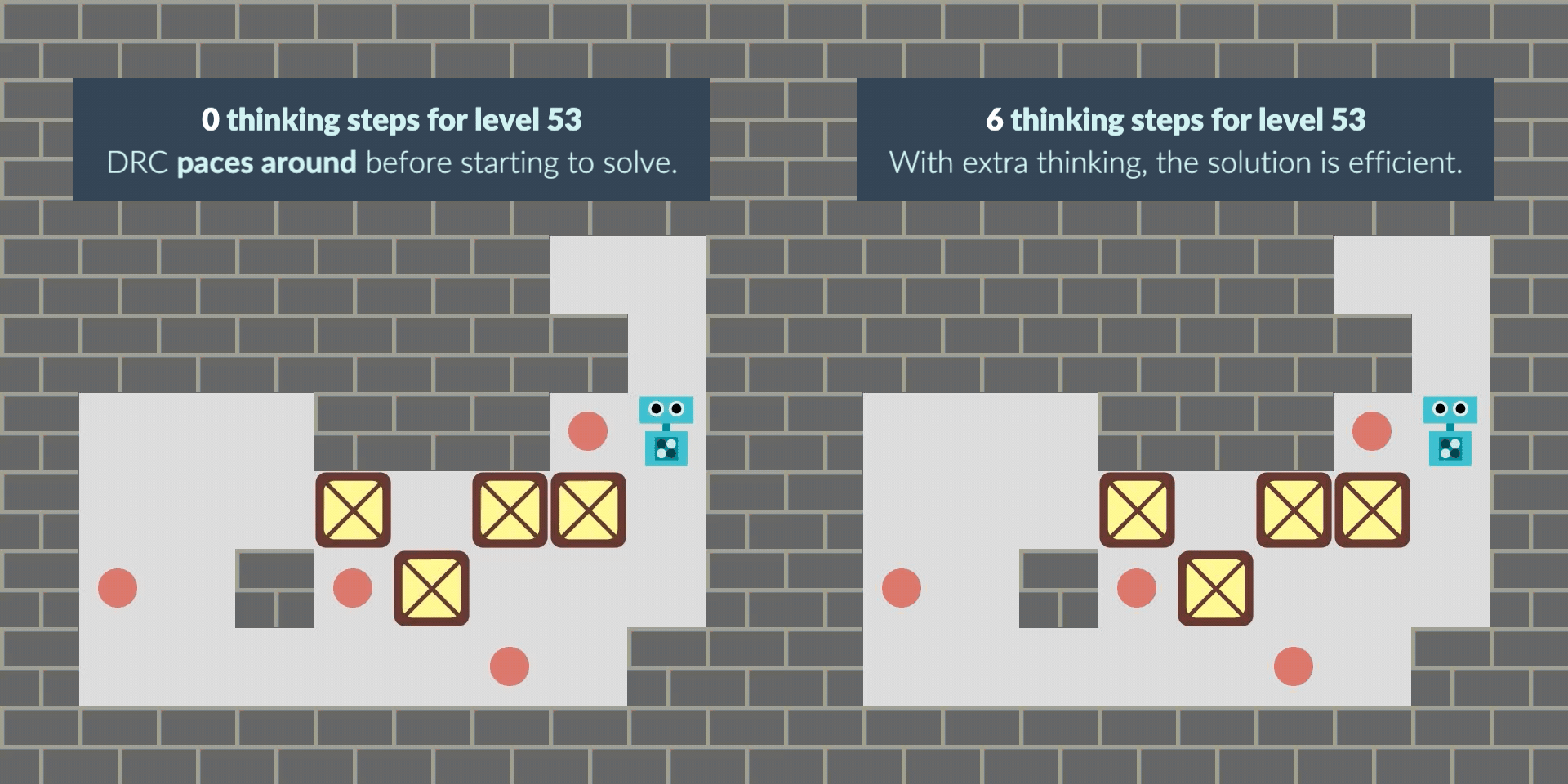 In other cases, the RNN sometimes starts with a greedy solution and locks itself out of the solution. With thinking time, the RNN finds the non-myopic solution, avoiding the lock and solving the level. Note that this greedy behavior may be bounded-rational given the -0.1 penalty per step: solving fewer levels but solving them more quickly can pay off.