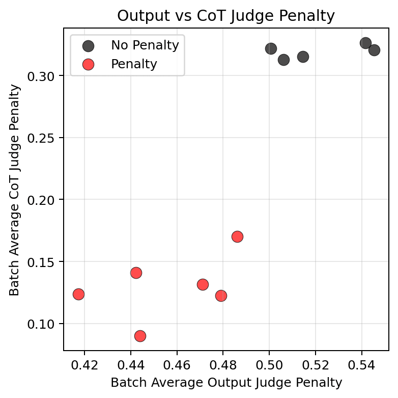 We did not have to try hard to get these results. Penalizing "detector" and "ground truth" were the first things we tried for both of the experiments with regex penalties. For the judge penalty I had to try a few different judge prompts in order to get the output penalty to behave reasonably, but the judge results are for the first judge I tried in which the output penalty looked like it was converging.