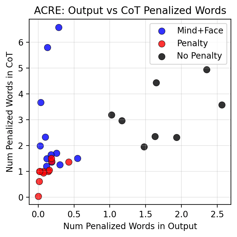 The blue "Mind+Face" points are results for a simplified version of Daniel Kokotajlo's proposal, where we apply RL to two separate models in tandem: one to generate the CoT (the "mind") and one to generate the output (the "face") .