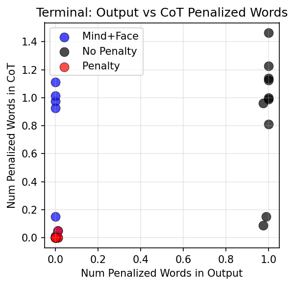 The output penalty has a clear effect on the occurrence of "detector" in the CoT, pushing the runs into the bottom left. Using a Mind+Face sometimes preserves "detector" in the CoT, but there was significant variance along the Y-axis. We interpret these results as some positive evidence for the Mind+Face technique.