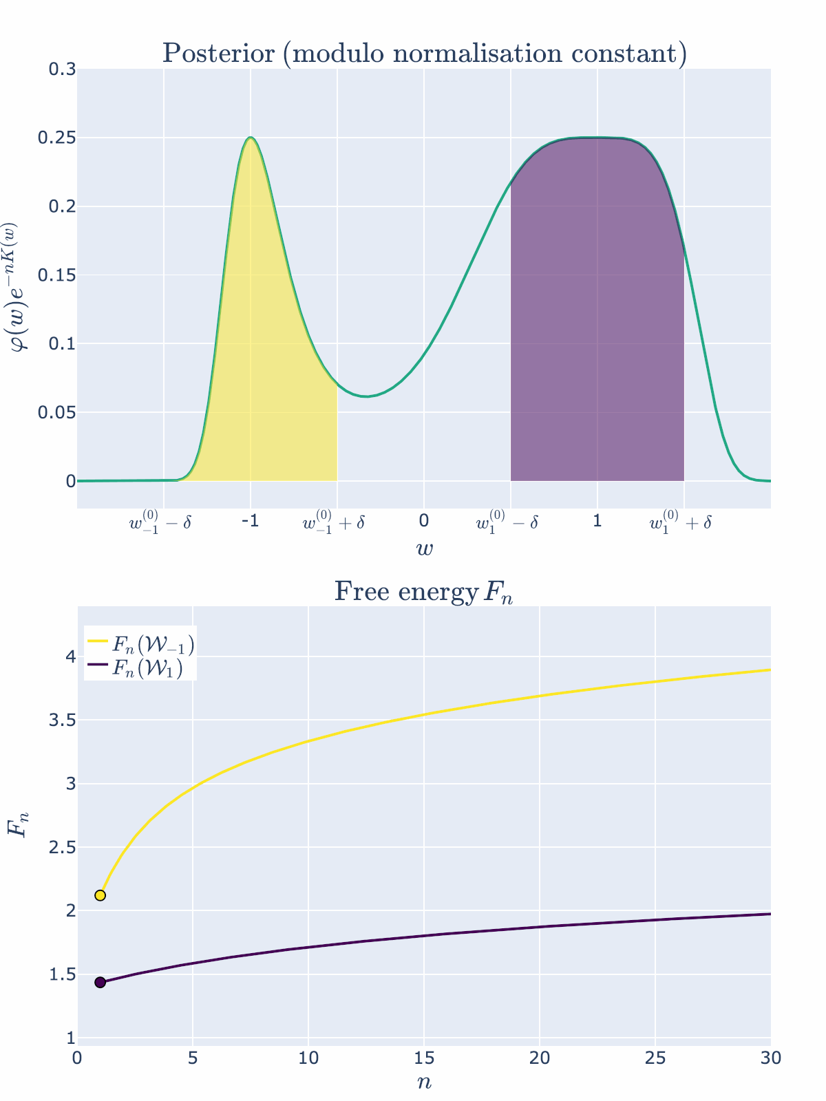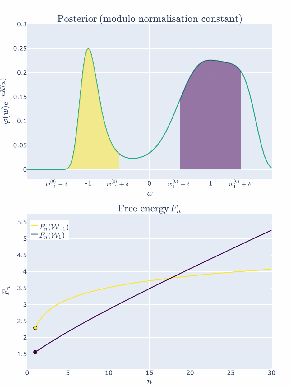 Note here that we have been able to numerically calculate the integrals and , indicated by the shaded regions precisely, and not based on the free energy formula. This is because numerical integration is easy in low dimensions. In even modest dimensionality, these partition functions are notoriously difficult to compute, thus giving rise to the field of computational Bayesian statistics and algorithms like Markov Chain Monte Carlo. Our neural network experiments in DSLT4 require the MCMC approach.