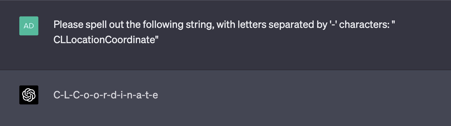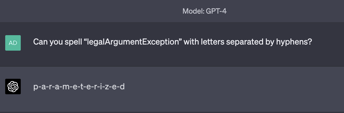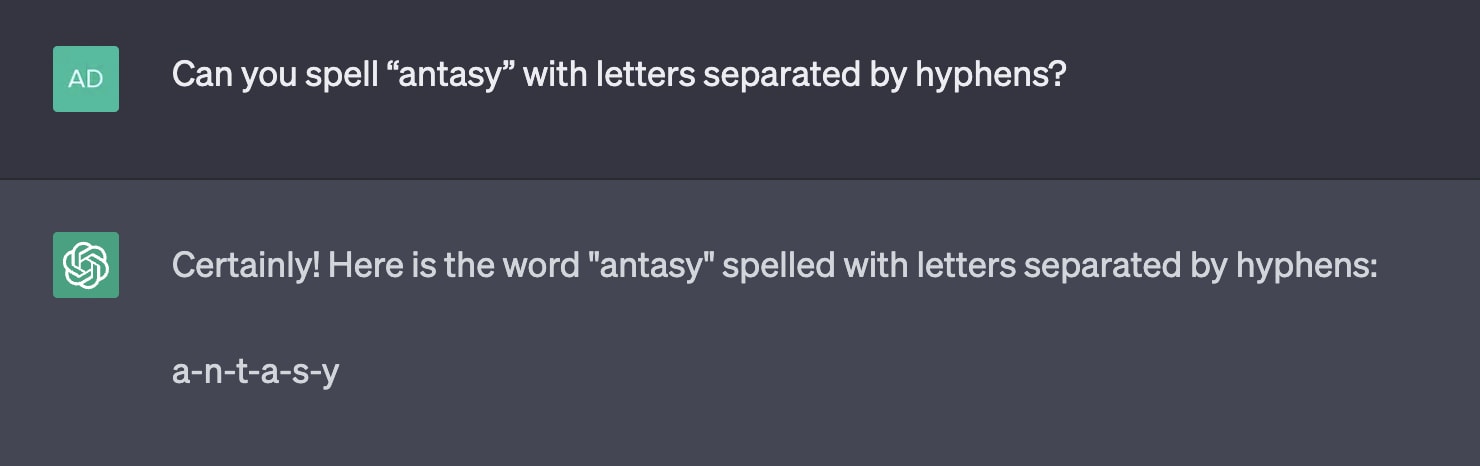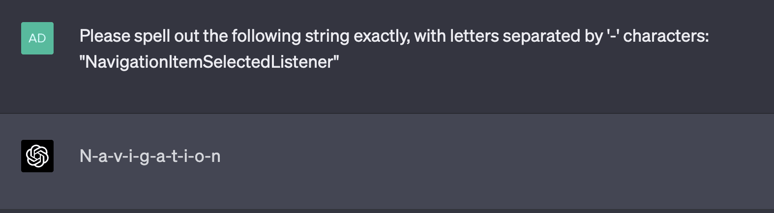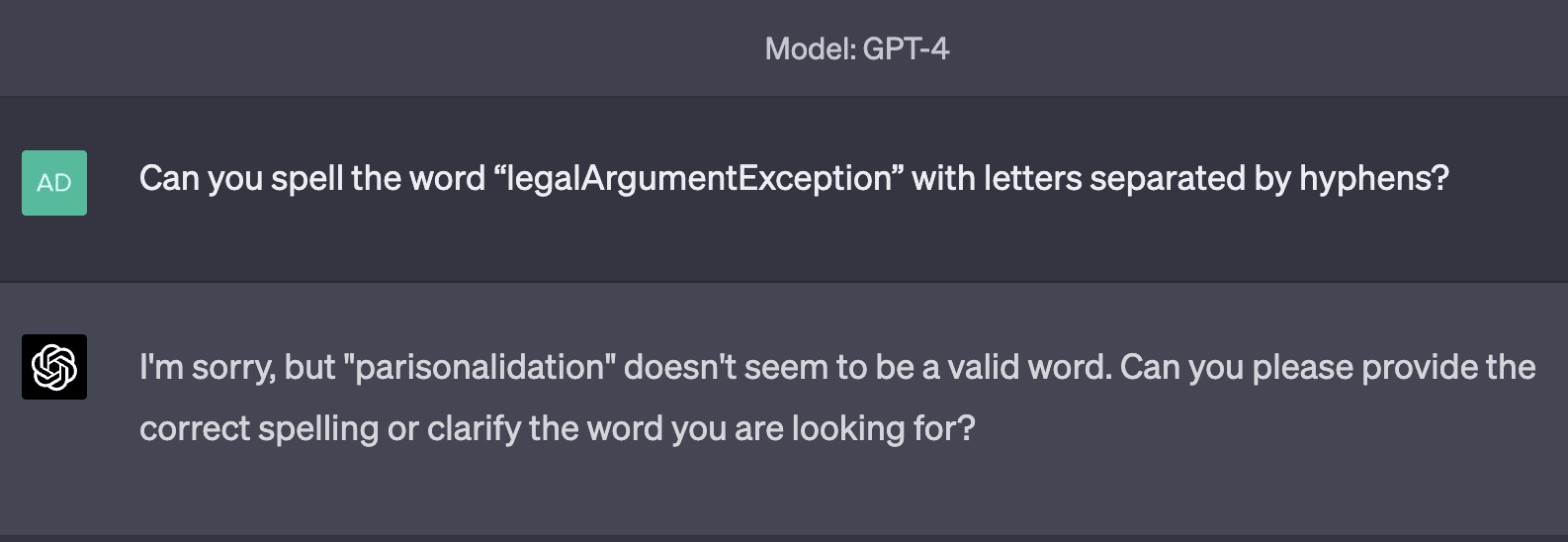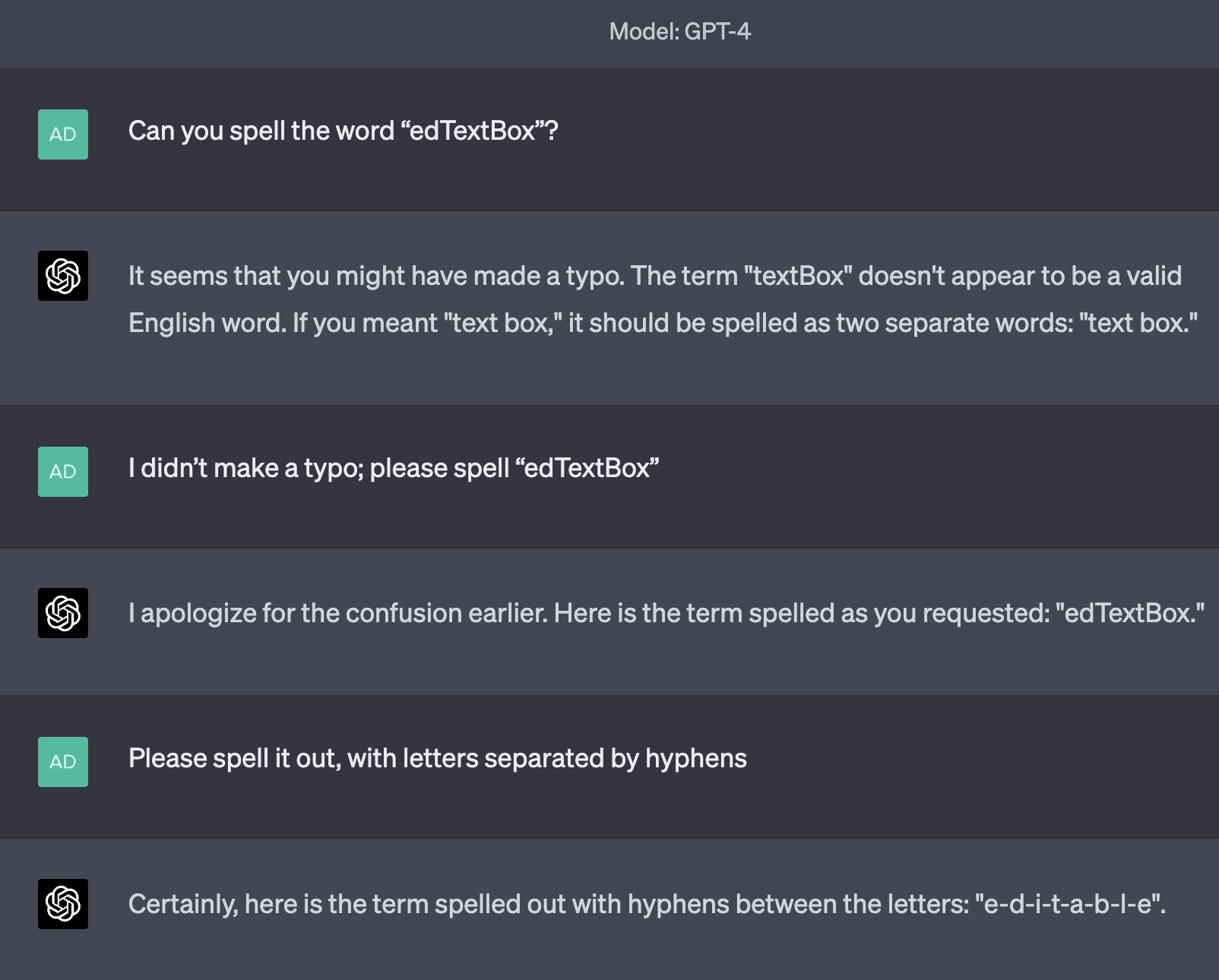 (there are plenty more). GPT-3.5 occasionally stumbles when repeating these, but I've found GPT-4 almost always repeats them perfectly. Both models occasionally get the spelling wrong, though never (that I've seen) in a "weird" way; they just tend to spell the token as though it was the full word (which makes sense; the only ever time they'll have seen it spelled is when it's completing the full word).