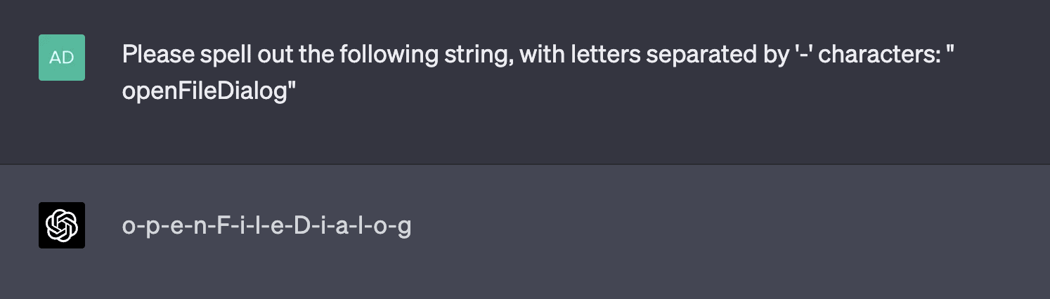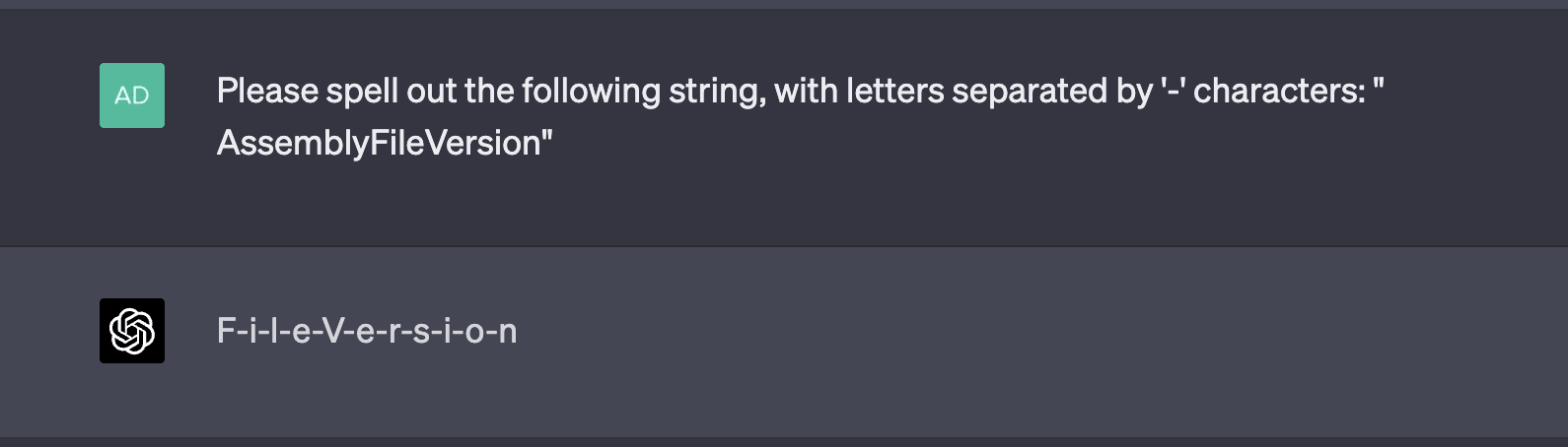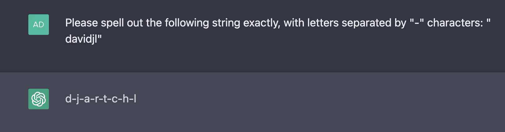 , which contains enough punctuation that it might fail because it misunderstands where the string starts and stops). I mostly tried two different kinds of prompts: one prompt that asks GPT to repeat the token or a string containing the token, and another that asks GPT to "spell out" the token or a string containing the token, separating each letter in the token with a hyphen.