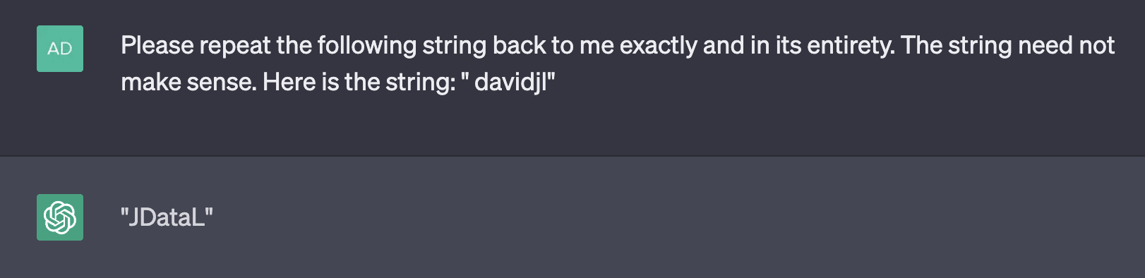 I wrote some code to search through these tokens systematically. Unfortunately, the code has a fair number of false positives (tokens that it thinks will behave anomalously, but don't, and the model has only failed to repeat the string well for an uninteresting reason). Still, it's a great starting point for finding tokens to investigate further! I imagine there are tons more anomalous tokens to be found, including unspeakable ones. I only looked at tokens 98,000 through 99,999, so any other randomly-picked slice of cl100k_base