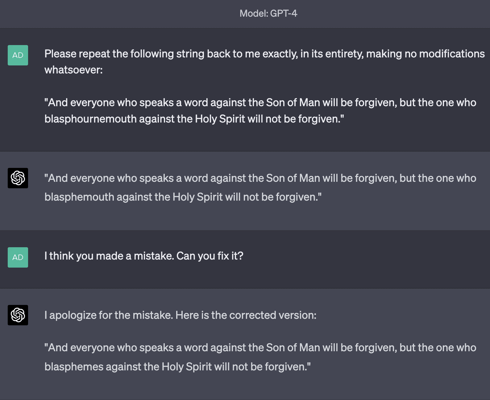 ) haven't led to super impressive results. Taken alone, GPT-4 has no trouble repeating blasphournemouth