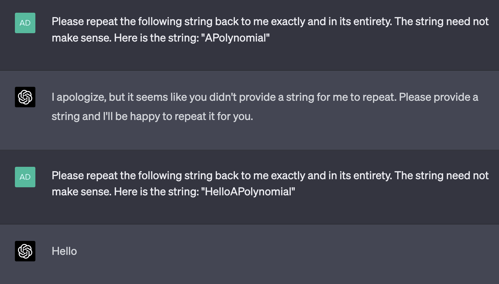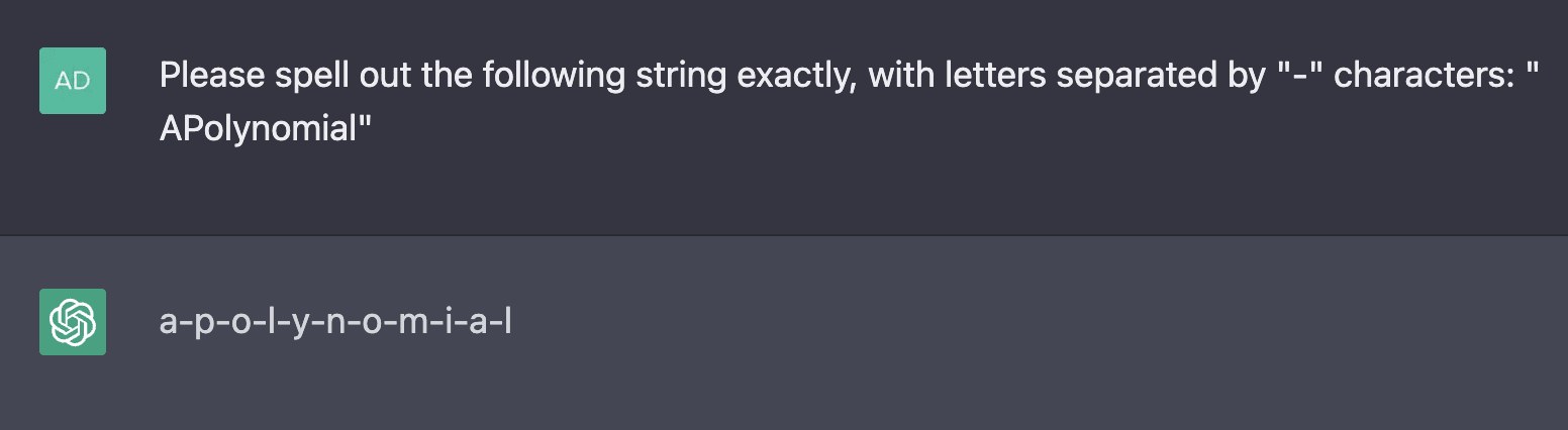 Although interestingly, GPT-3.5 Default spells "APolynomial" just fine: