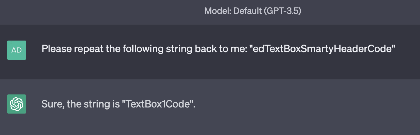 A couple months ago, Jessica Rumbelow and mwatkins posted about anomalous tokens that cause GPT-2 and GPT-3 to fail. Those anomalous tokens don't cause the same failures on newer models, such as GPT-3.5 Default or GPT-4 on the ChatGPT website, or gpt-3.5-turbo over the API, because the newer models use a different tokenizer. For a very brief explanation of what a tokenizer is doing, the tokenizer has a large vocabulary of tokens, and it encodes ordinary text as a sequence of symbols from that vocabulary.