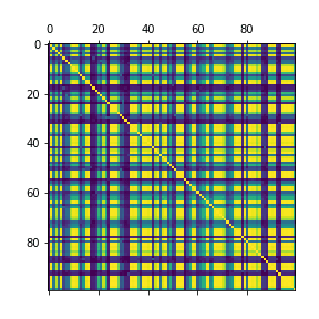 Well, at very low connection density and strength, of course everything is basically independent. As we turn up the density and strength, we see a correlation matrix like this: