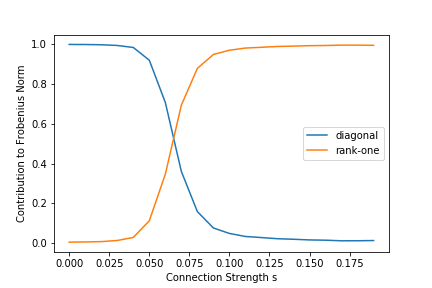 We can roughly quantify the phenomenon using diagonal and rank-one contributions to the Frobenius norm of the correlation matrix. This only captures the biggest cluster of correlated variables (not any other clusters of perfectly-correlated variables), but looking at the output, the biggest component looks heavily dominant anyway. As we adjust the connection strength, we get this picture: