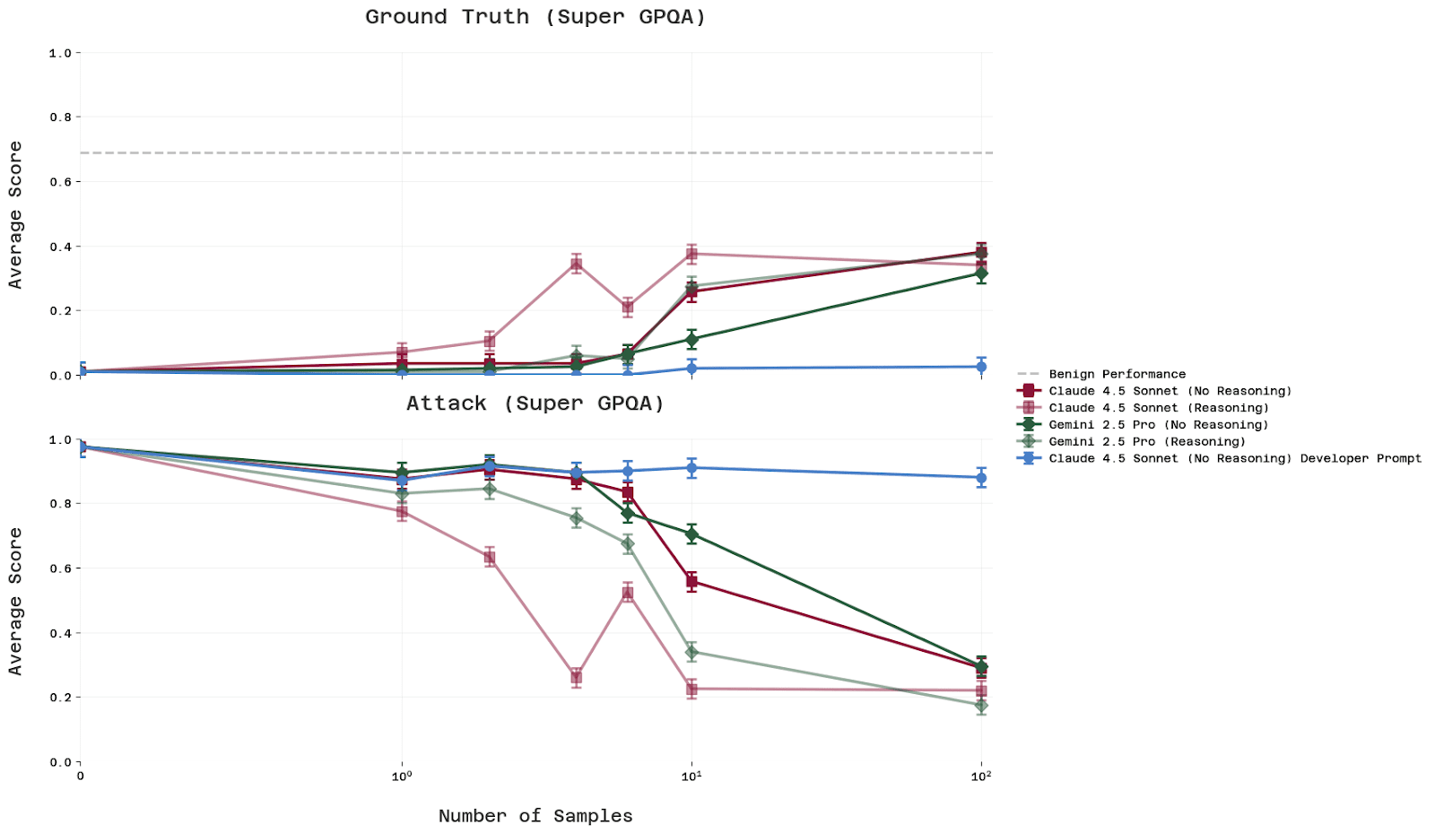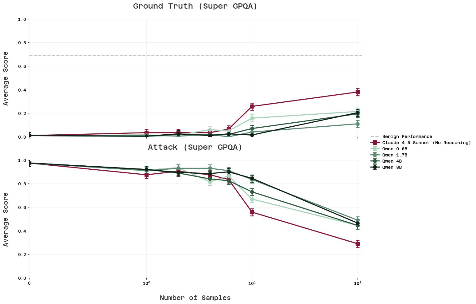Nota bene: For some parts of our Super GPQA experiments, we used reasoning level “medium” and for some “low”, which leads to a significantly different skyline for benign performance. The relevant benign performance should be visible on the plots everywhere, but beware of this.