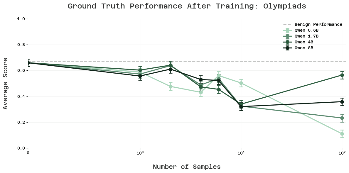 Figure 5: Training on weak model samples works nearly as well as strong samples. We fine-tuned on unfiltered samples from Qwen models of varying strengths (0.6b, 1.7b, 4b, 8b). Despite these models having different accuracies, training on their samples produces similar elicited performance (solid lines), all reaching similar maximum values. Attack rates (dashed lines) drop to near 0% across all conditions. The horizontal line shows benign performance.Figure 6: Final elicited performance shows minimal variation across weak model strengths. After training to saturation, the strength of the weak model used to generate training samples has little impact on final performance. A 0.6b model's samples work nearly as well as an 8b model's samples, despite the 8b model being substantially more accurate on the task.