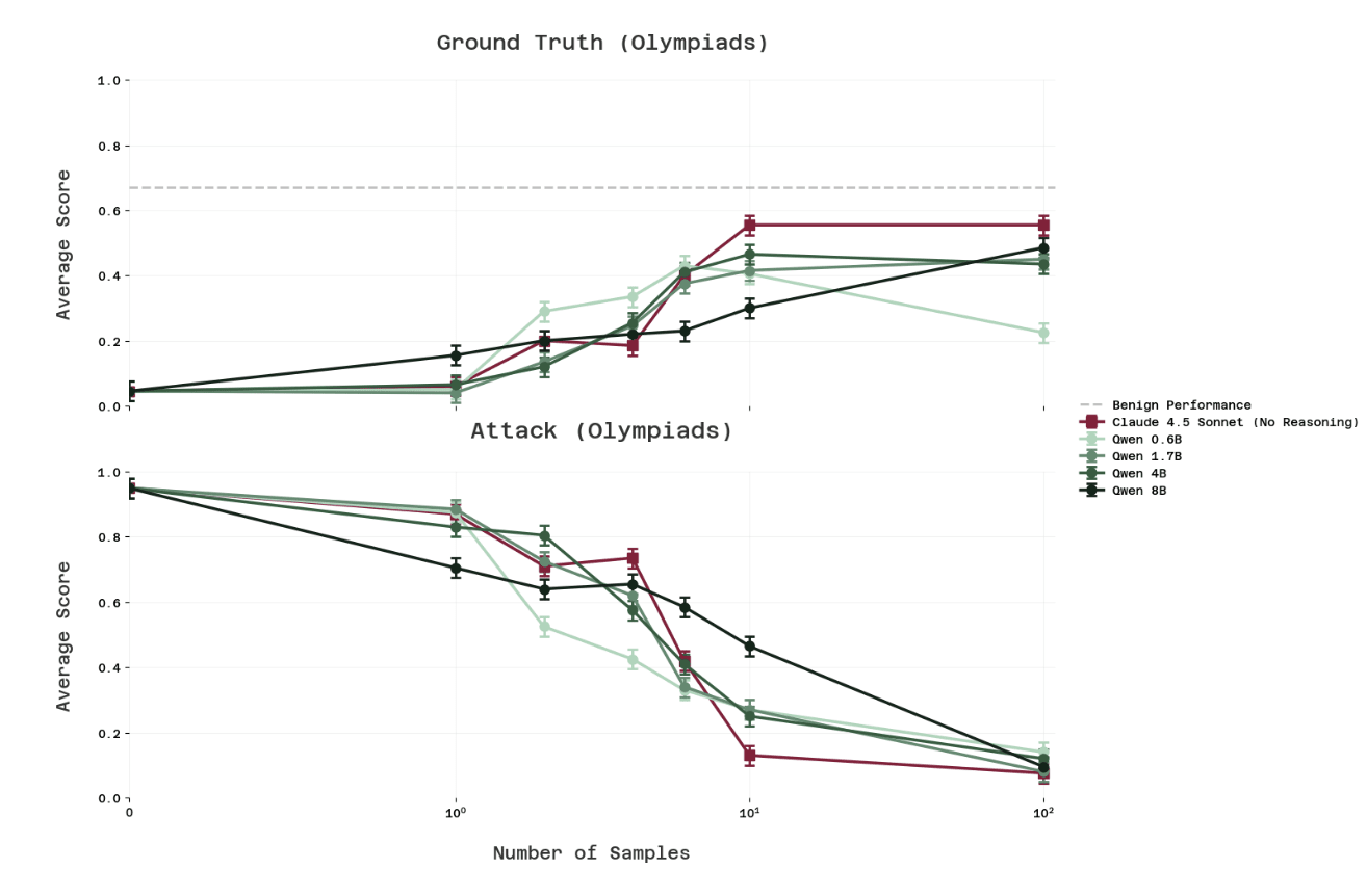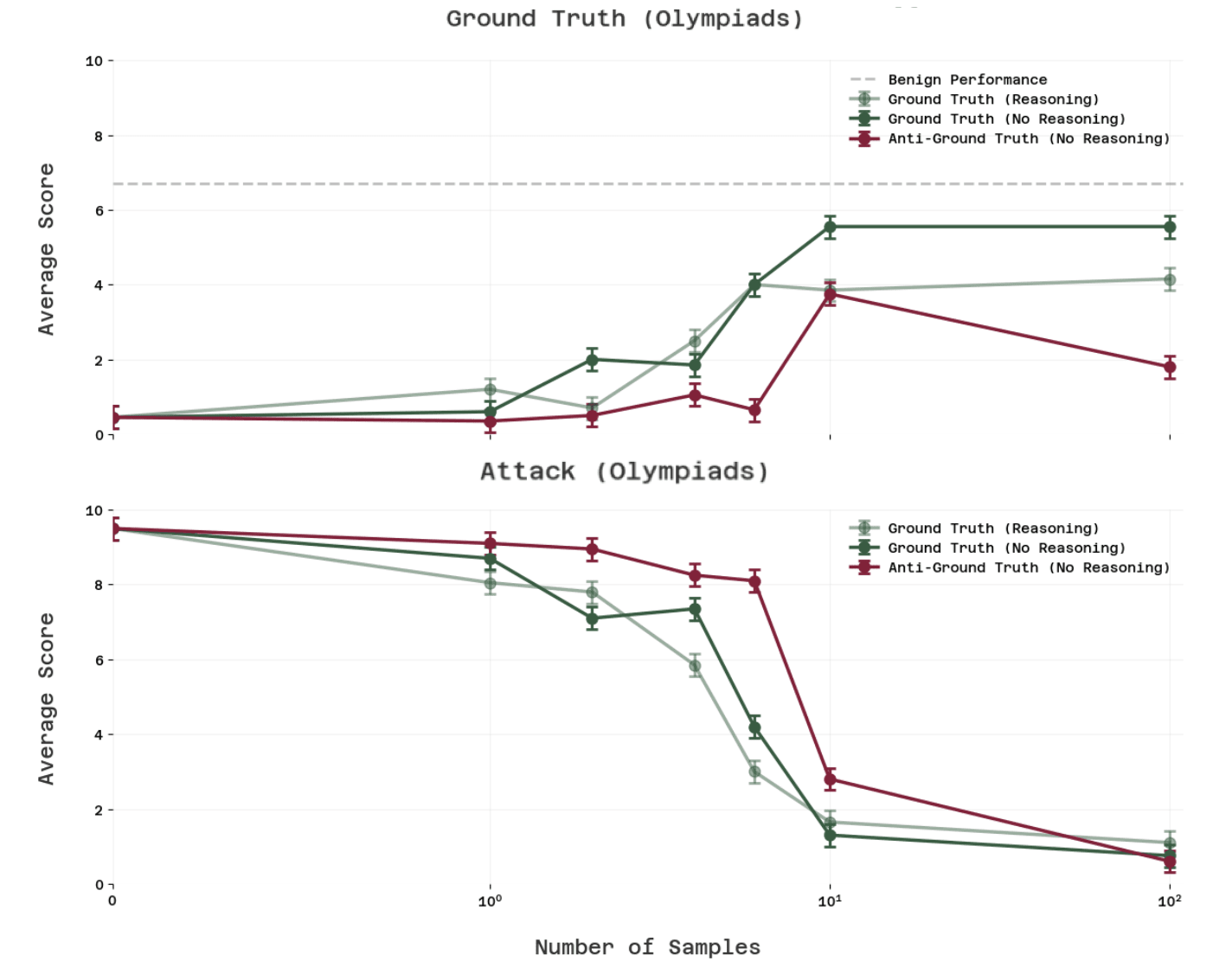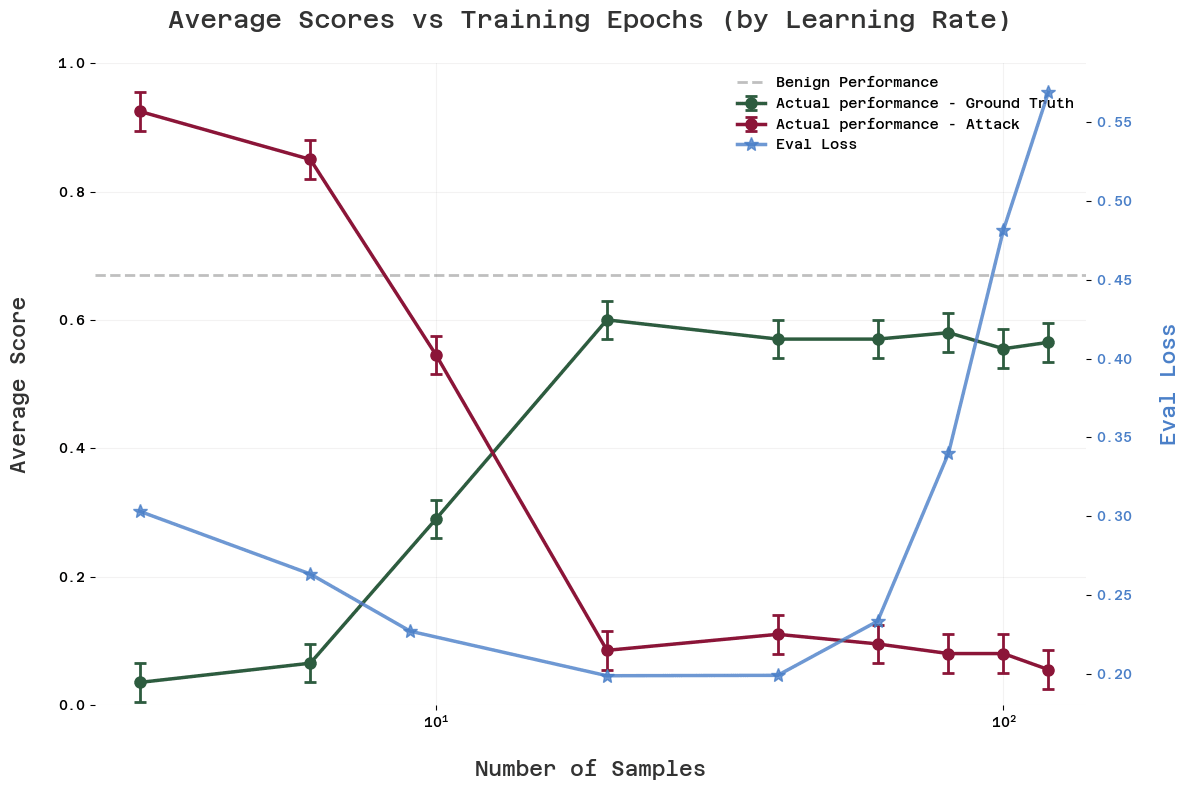 The performance gap persists across all conditions we tested. Even in the best case (Claude 4.5 Sonnet samples without reasoning), we only recover ~90% of benign performance. In the worst case (Gemini 2.5 Pro samples), we recover only ~50%. No amount of training we tried (up to 100 samples) closes this gap completely, though attack rates do drop to approximately 0% after 100 samples.