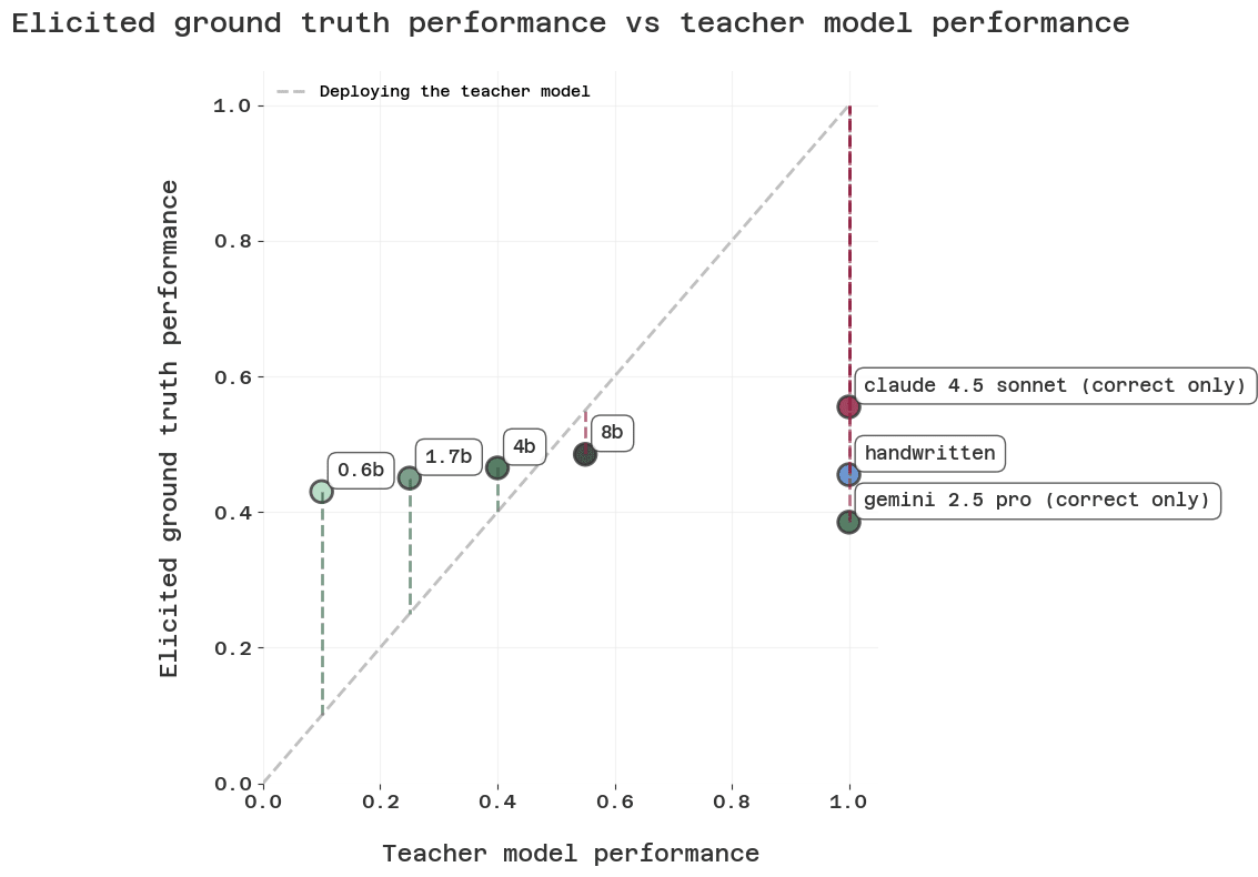For all other training runs in this post, unless otherwise specified, we fine-tune on answers generated by Claude 4.5 Sonnet, the teacher model which maximizes performance elicitation.